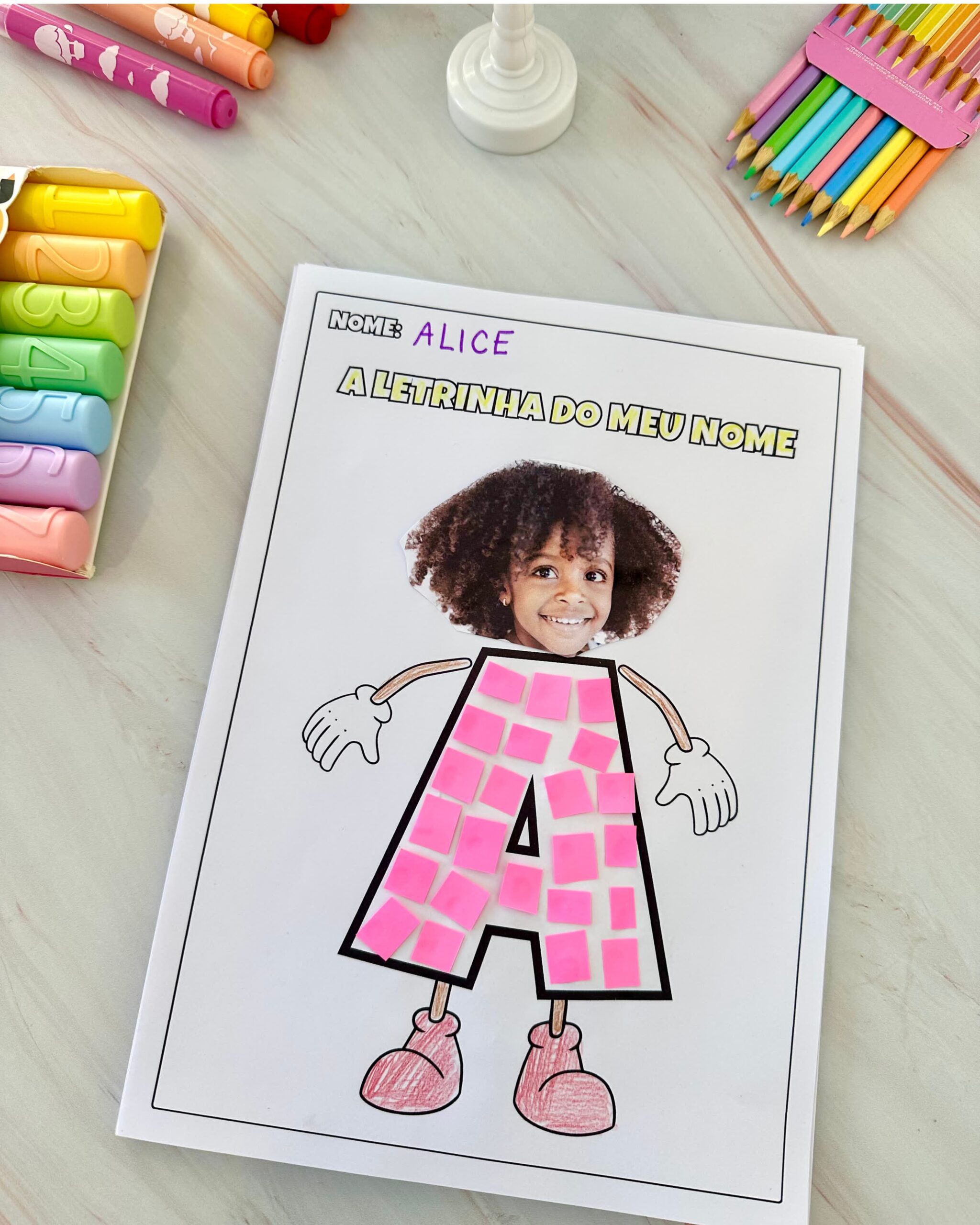 Atividade que pode ser personalizada com foto ou desenho dos rostinhos e o preenchimento das letras, pode-se colar papel picado, bolinhas de papel, lantejoulas, gliter ou colorir com lápis de cor ou guache.