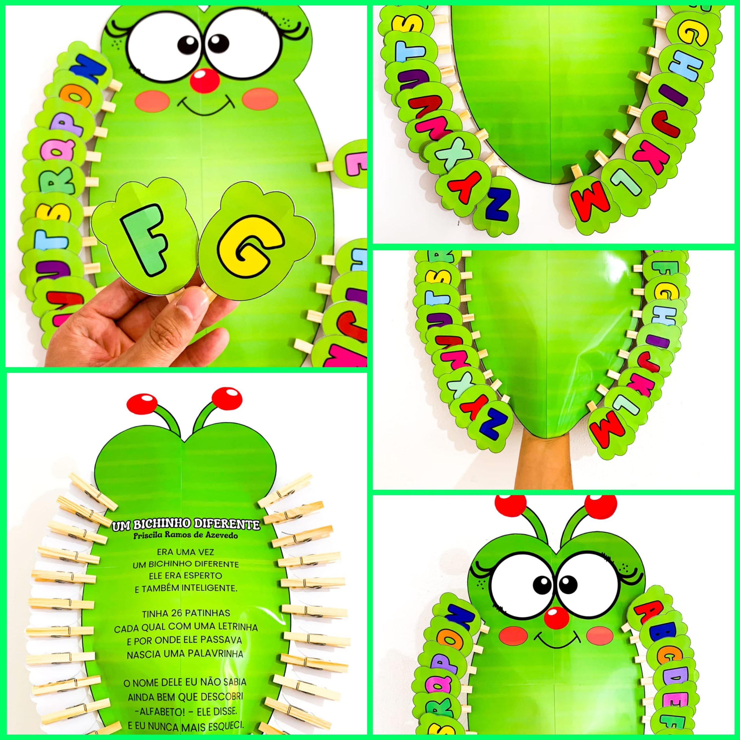 O material inclui luva ampliada com o Poema “Um bichinho Diferente” e fichas das letras do alfabeto em formato de patinhas para você utilizar no momento da contagem do poema.