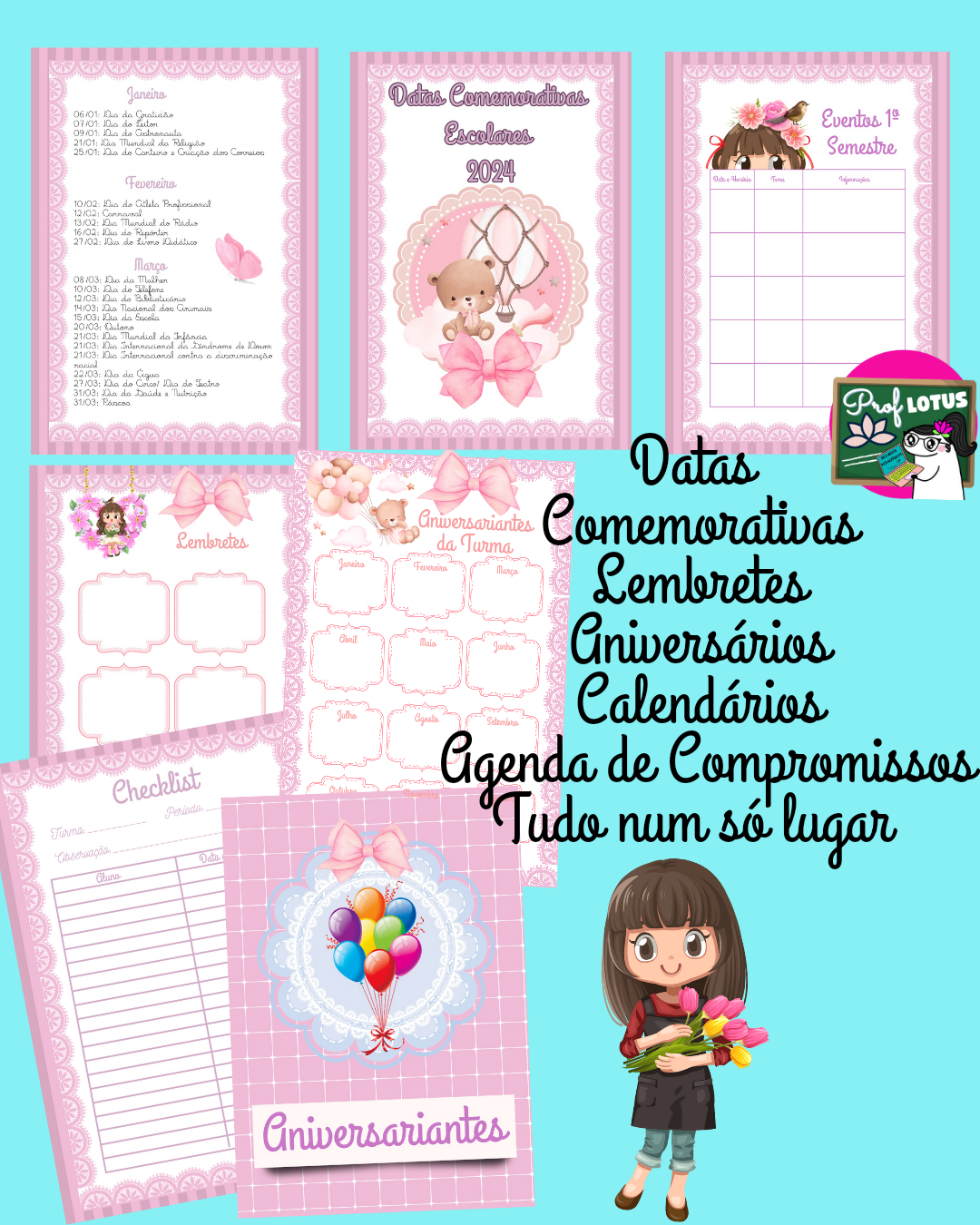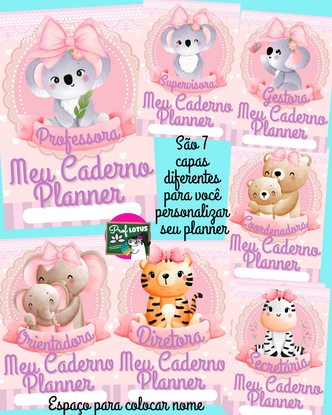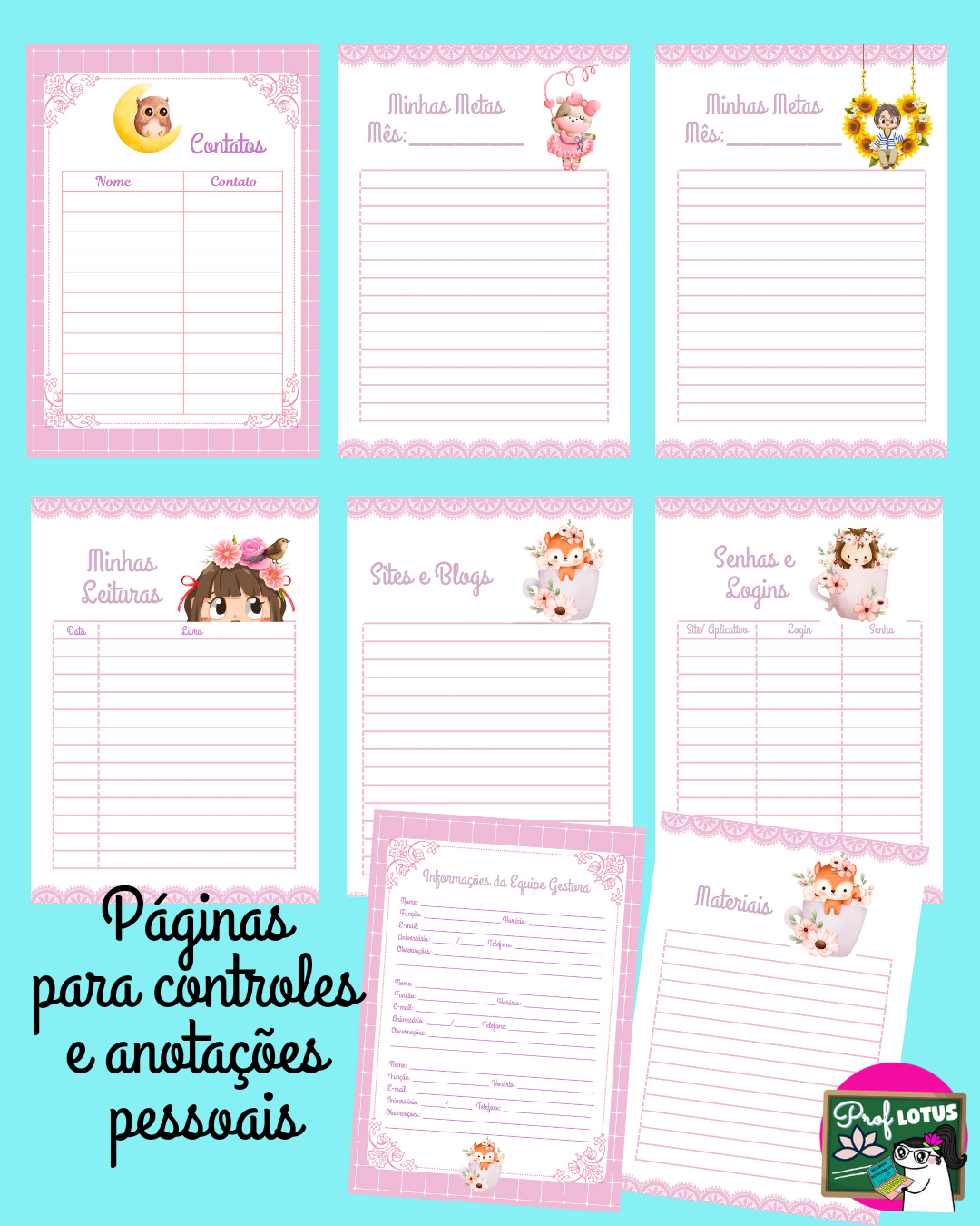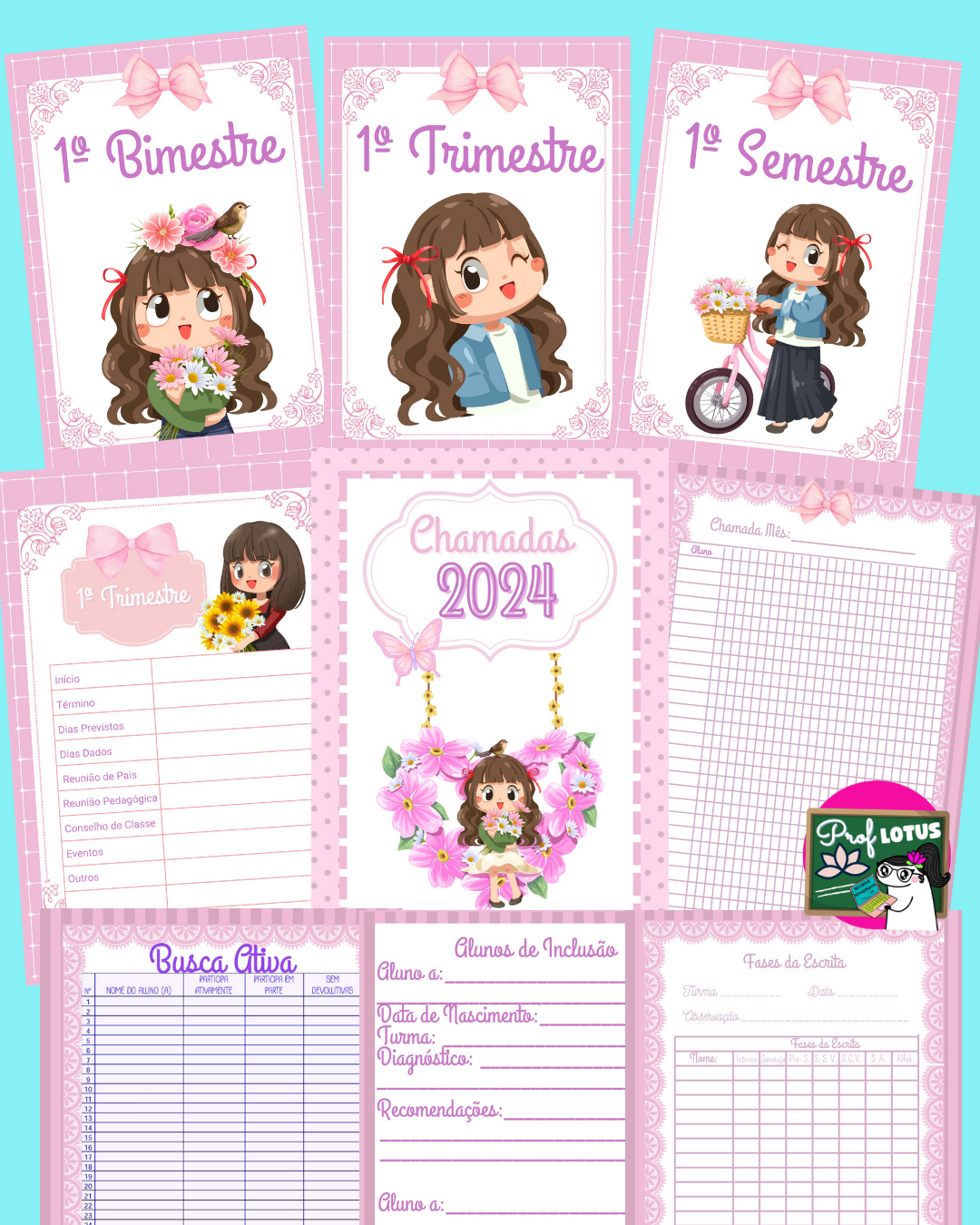Com páginas de anotações como informações pessoais, planner semanal, planejamento, projetos, chamada, páginas de atendimento ao aluno, lembretes, conselho de classe, reuniões e gestão escolar, etc…