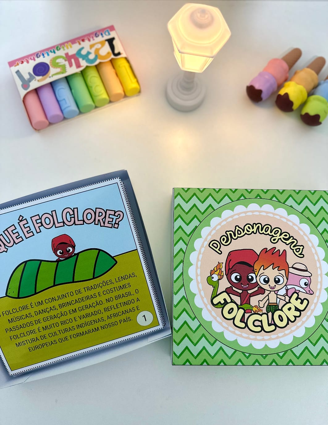 Livro na Caixa com a história do Folclore Brasileiro e também apresentação dos principais personagens.