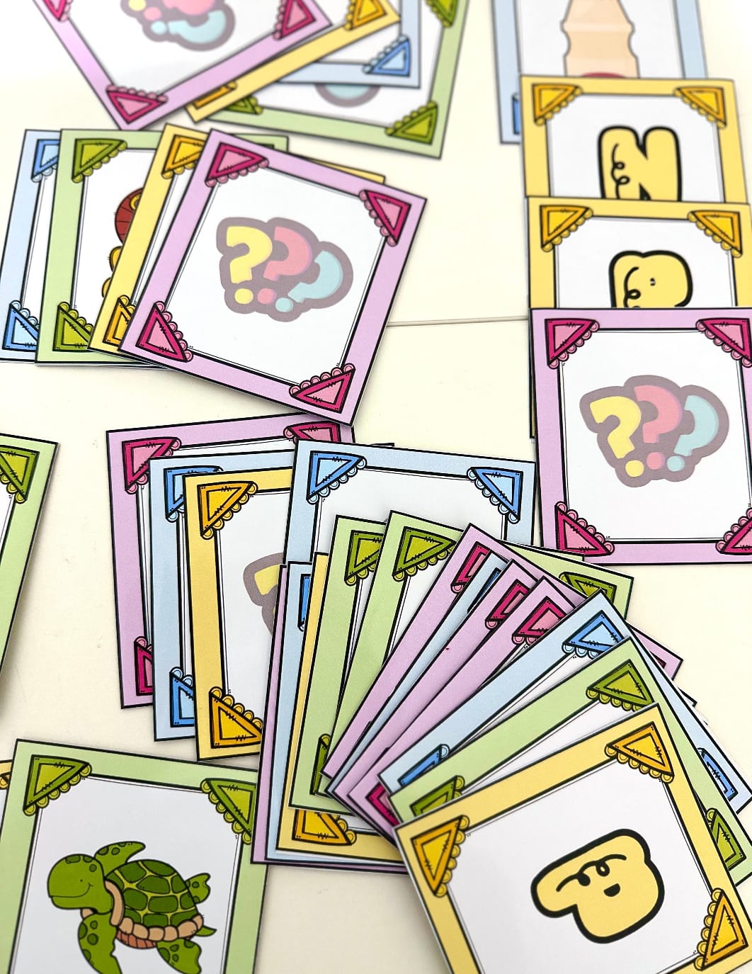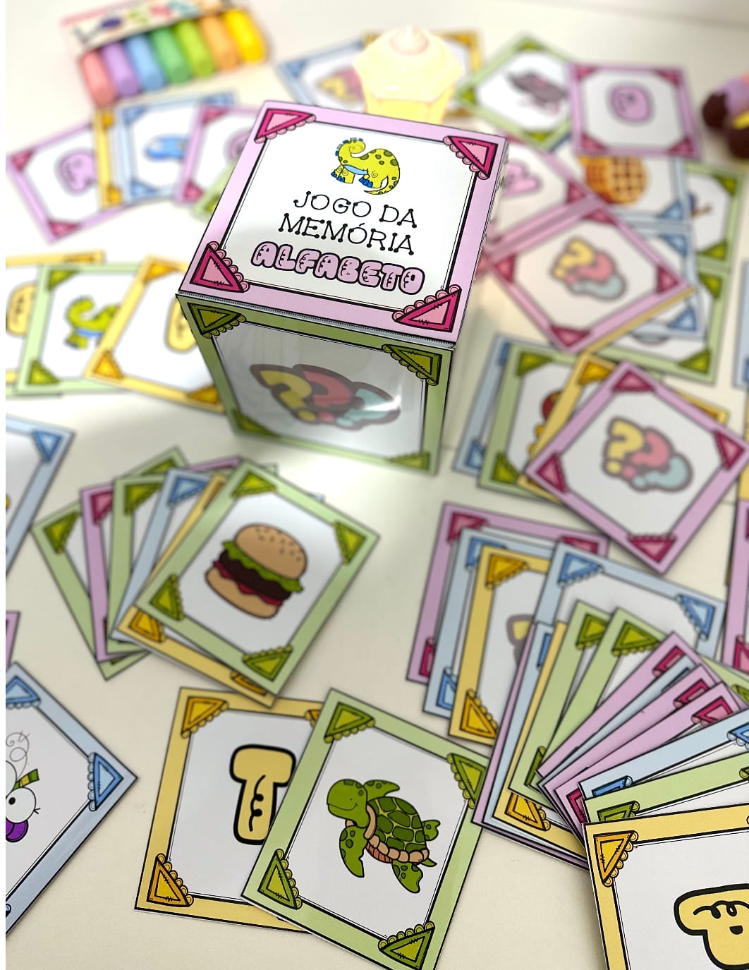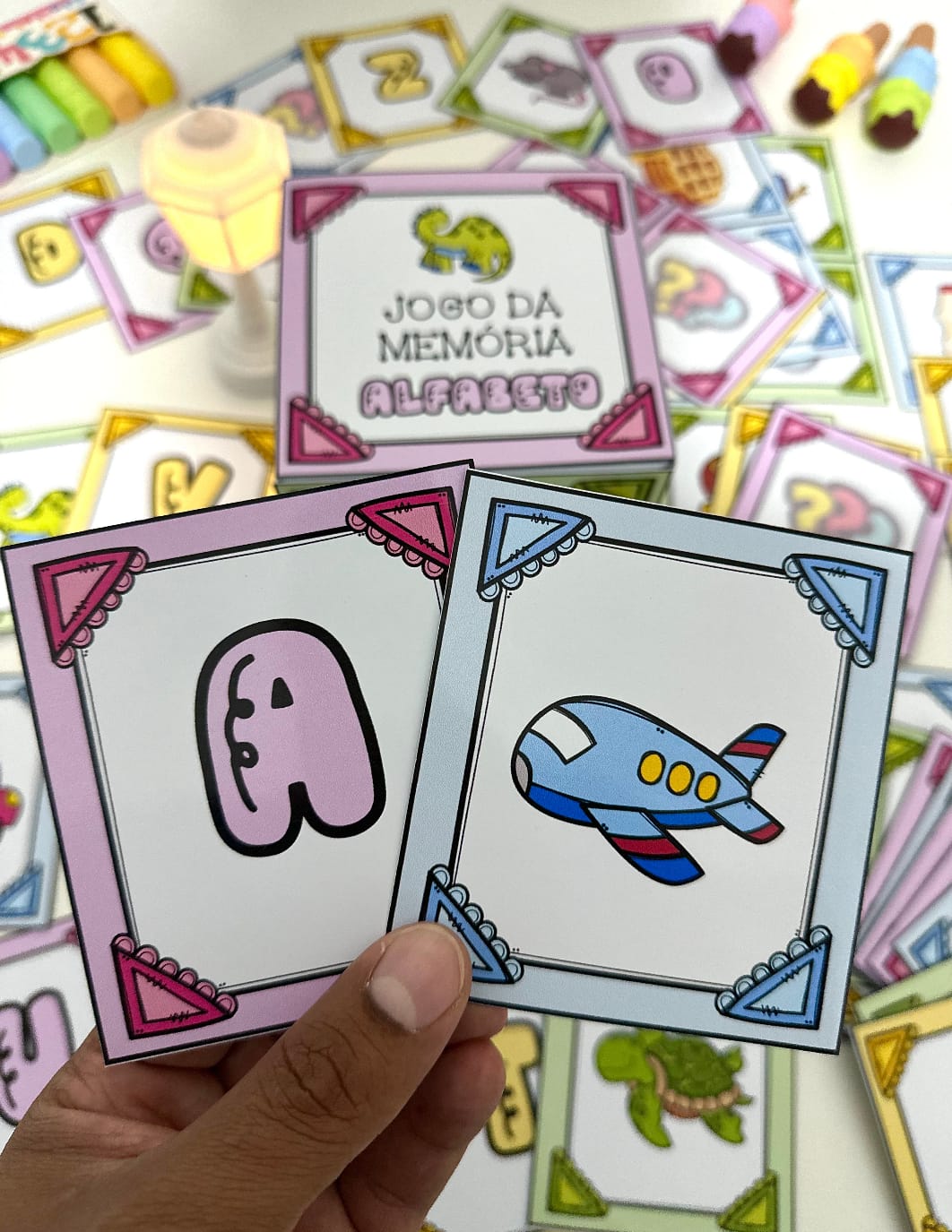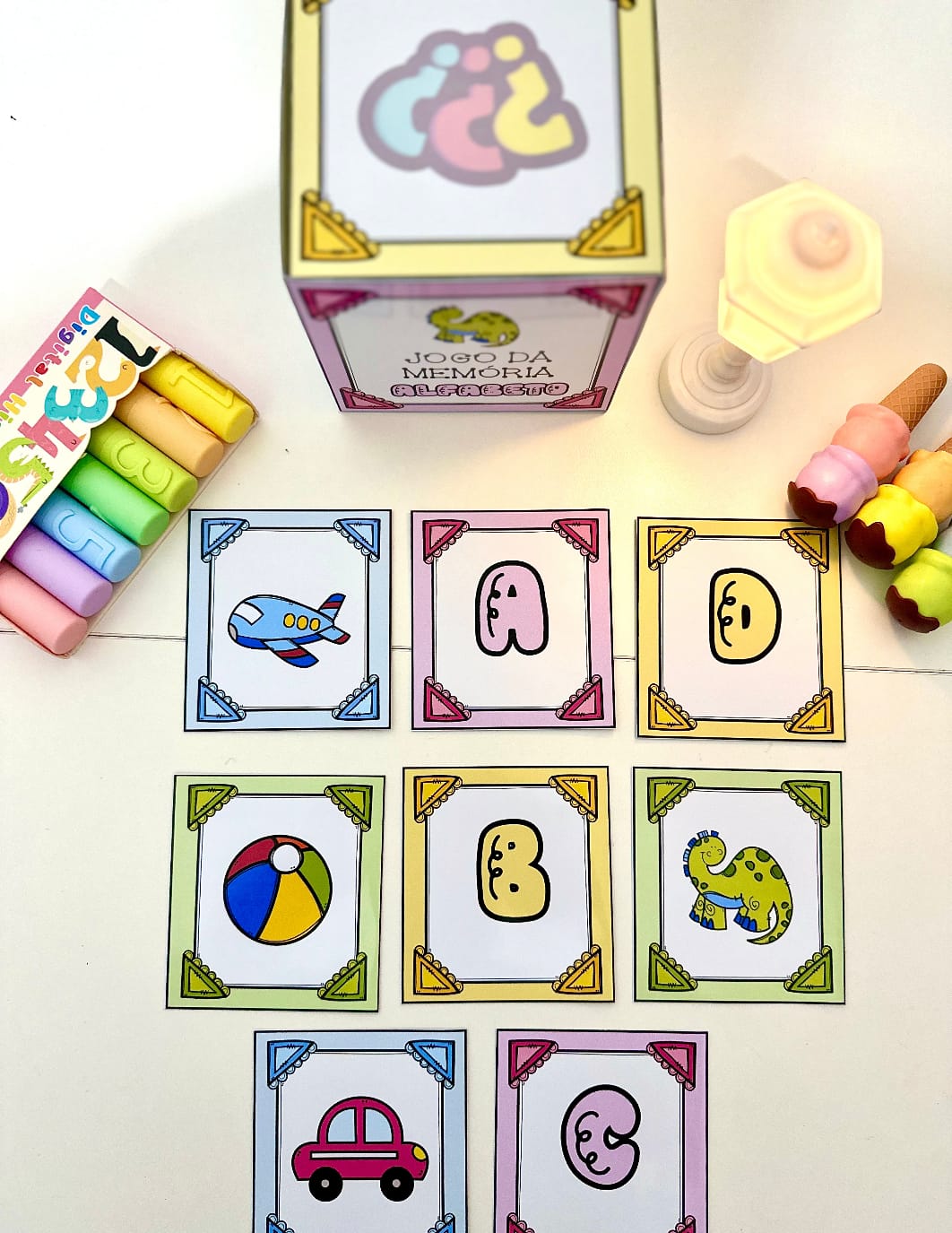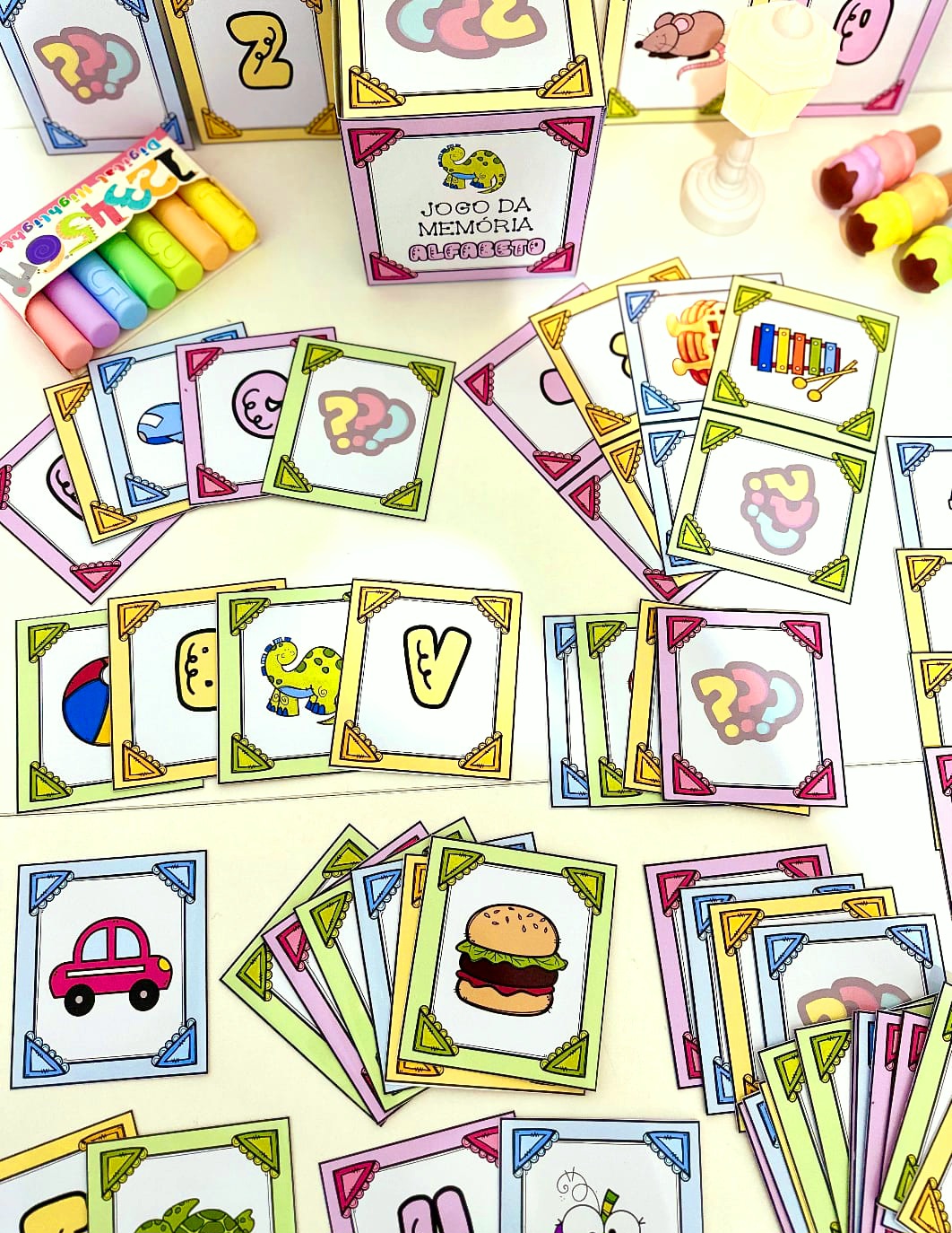 São 26 fichas com ilustrações e 26 fichas com as letras do