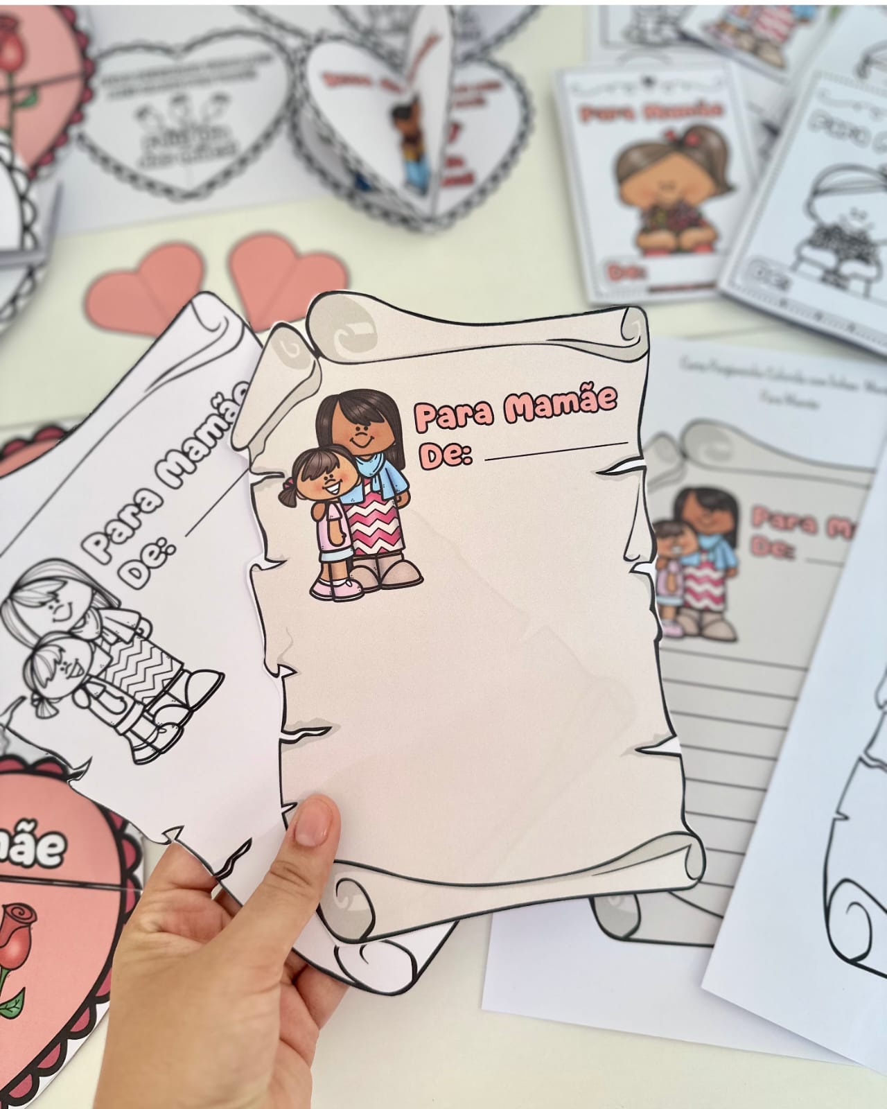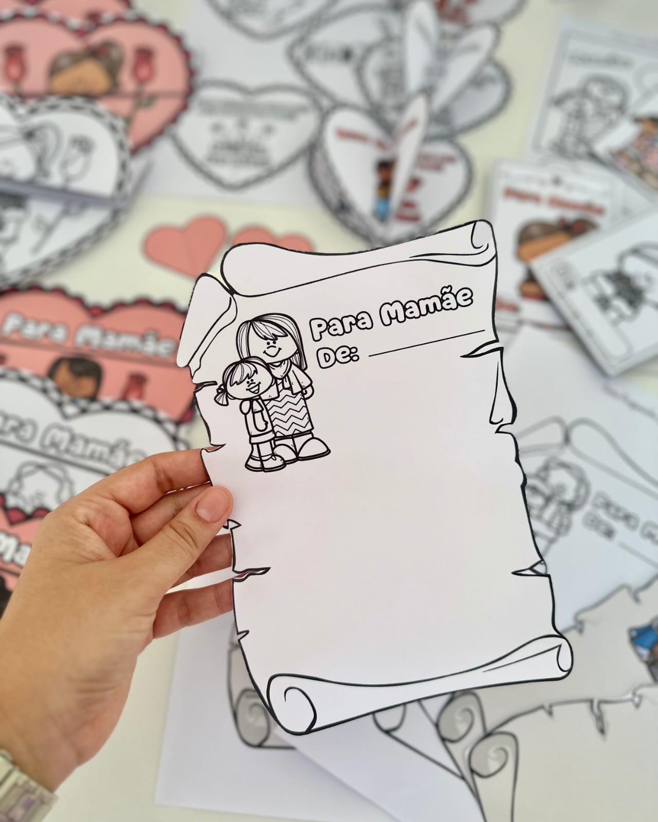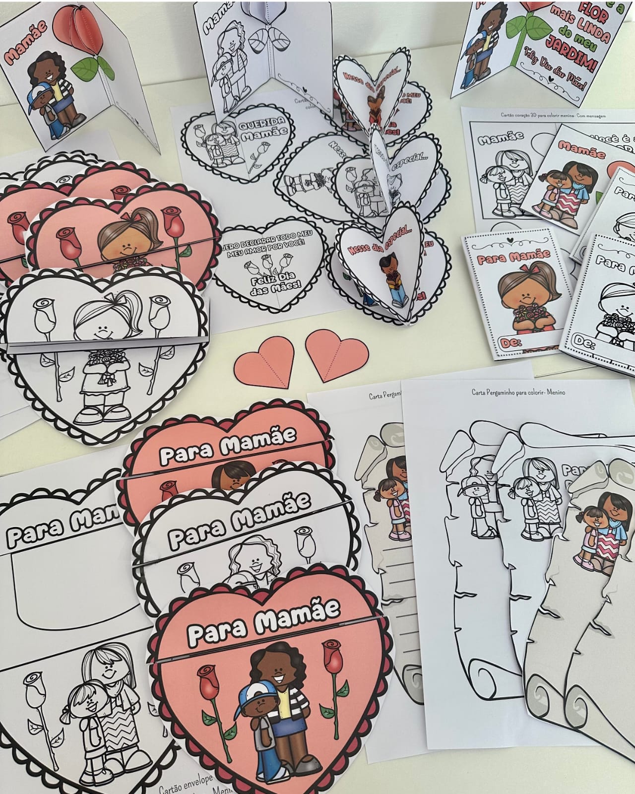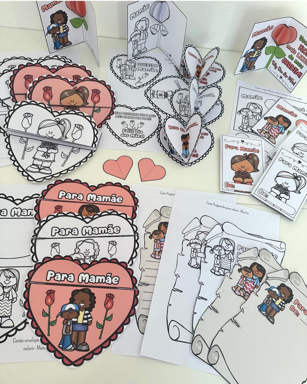 Todos os cartões têm opções colorida e para colorir “Para mamãe” e “Para quem cuida de mim”.