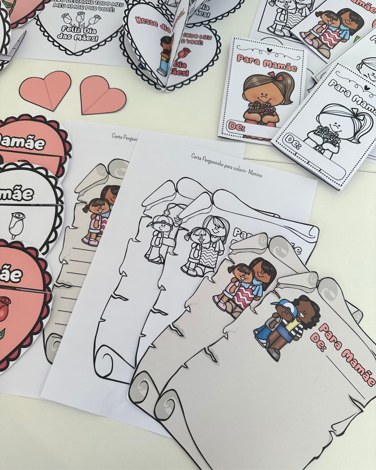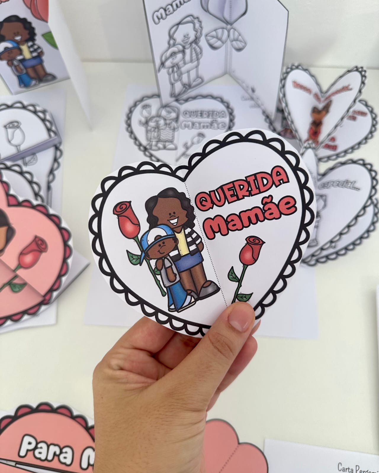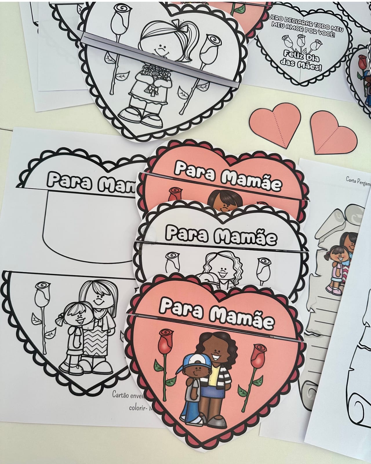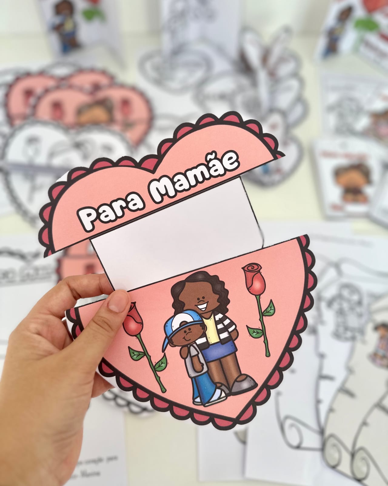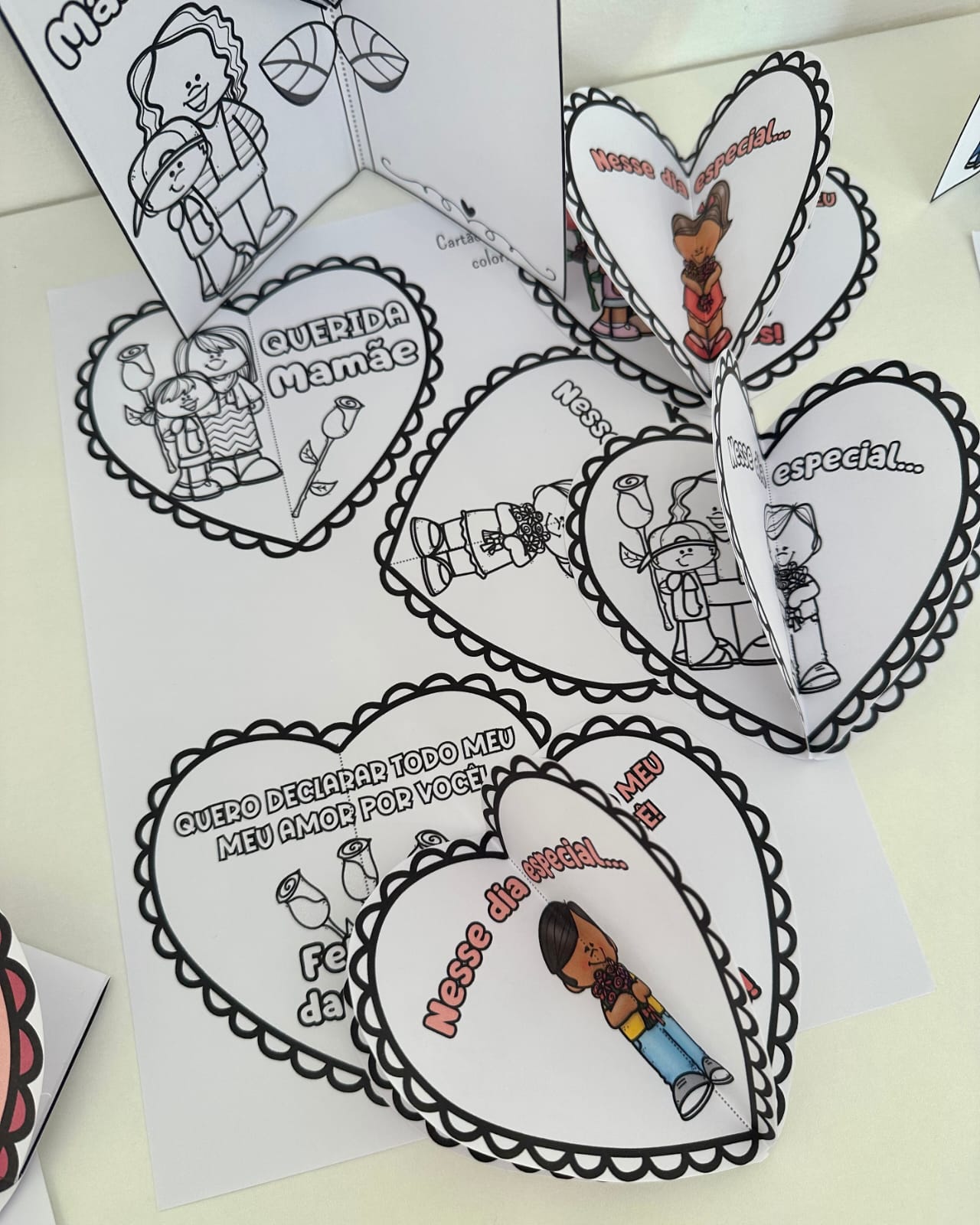 Todos os cartões têm opções colorida e para colorir “Para mamãe” e “Para quem cuida de mim”.