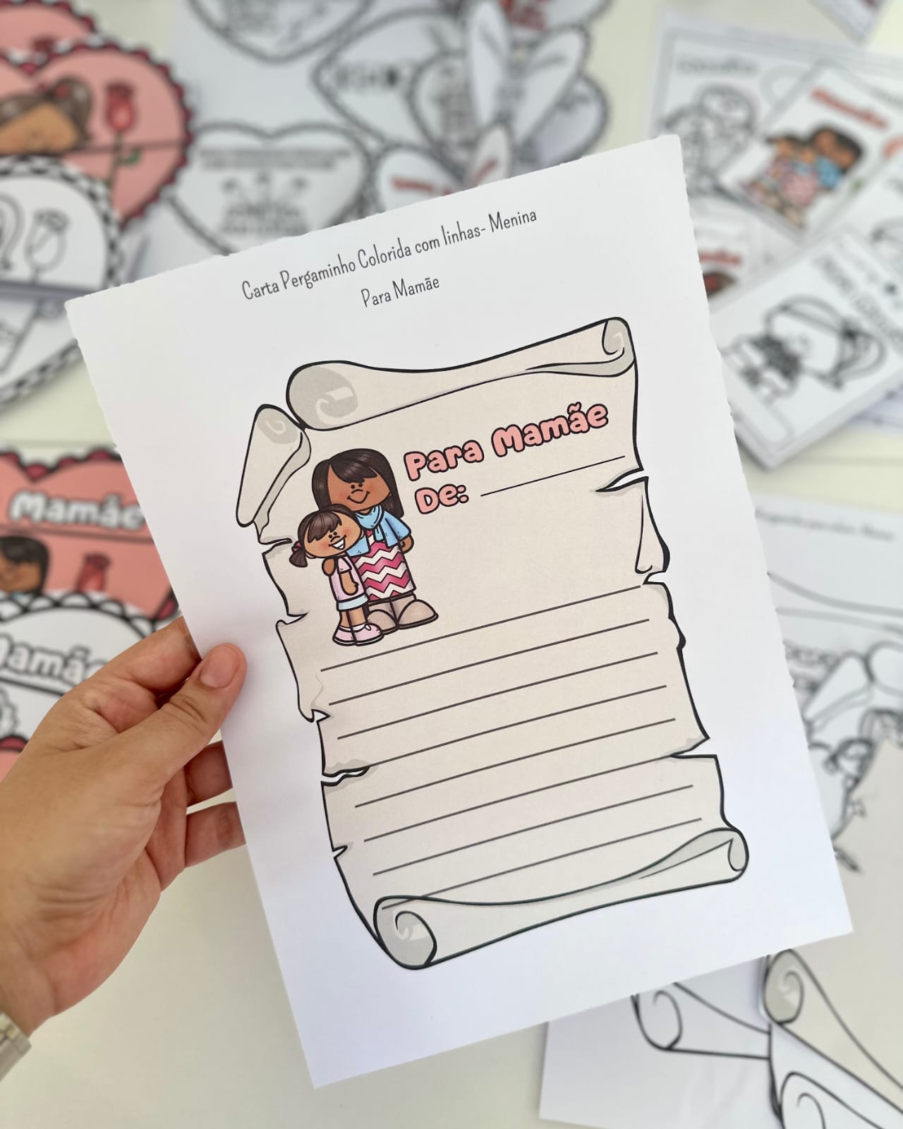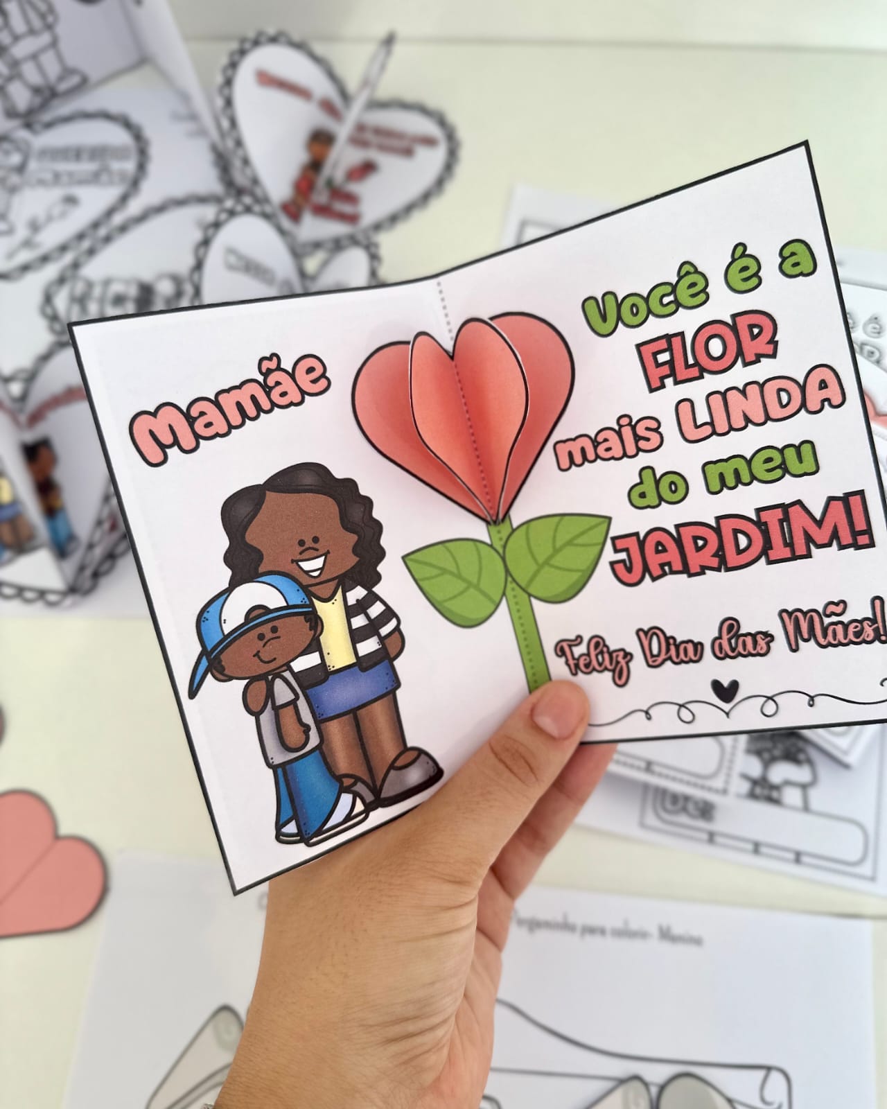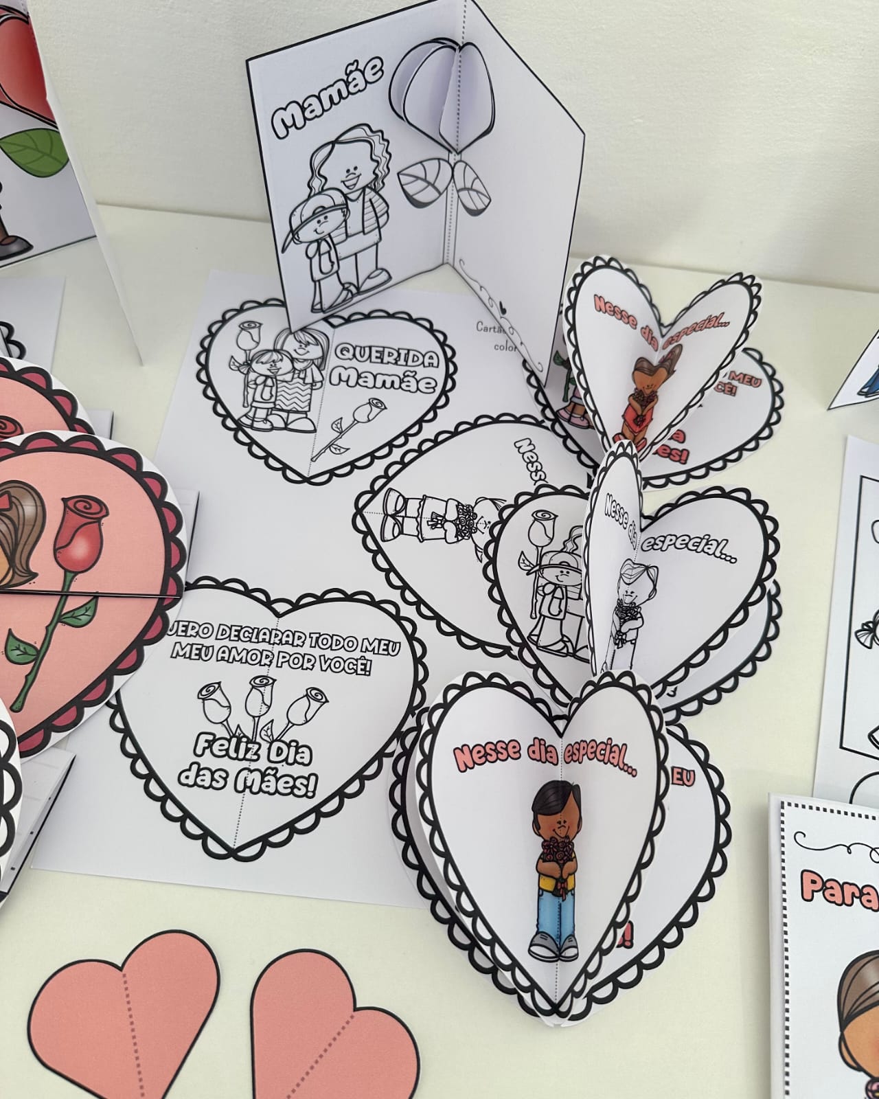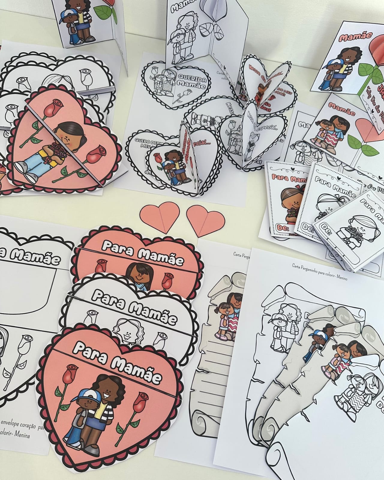 Todos os cartões têm opções colorida e para colorir “Para mamãe” e “Para quem cuida de mim”.