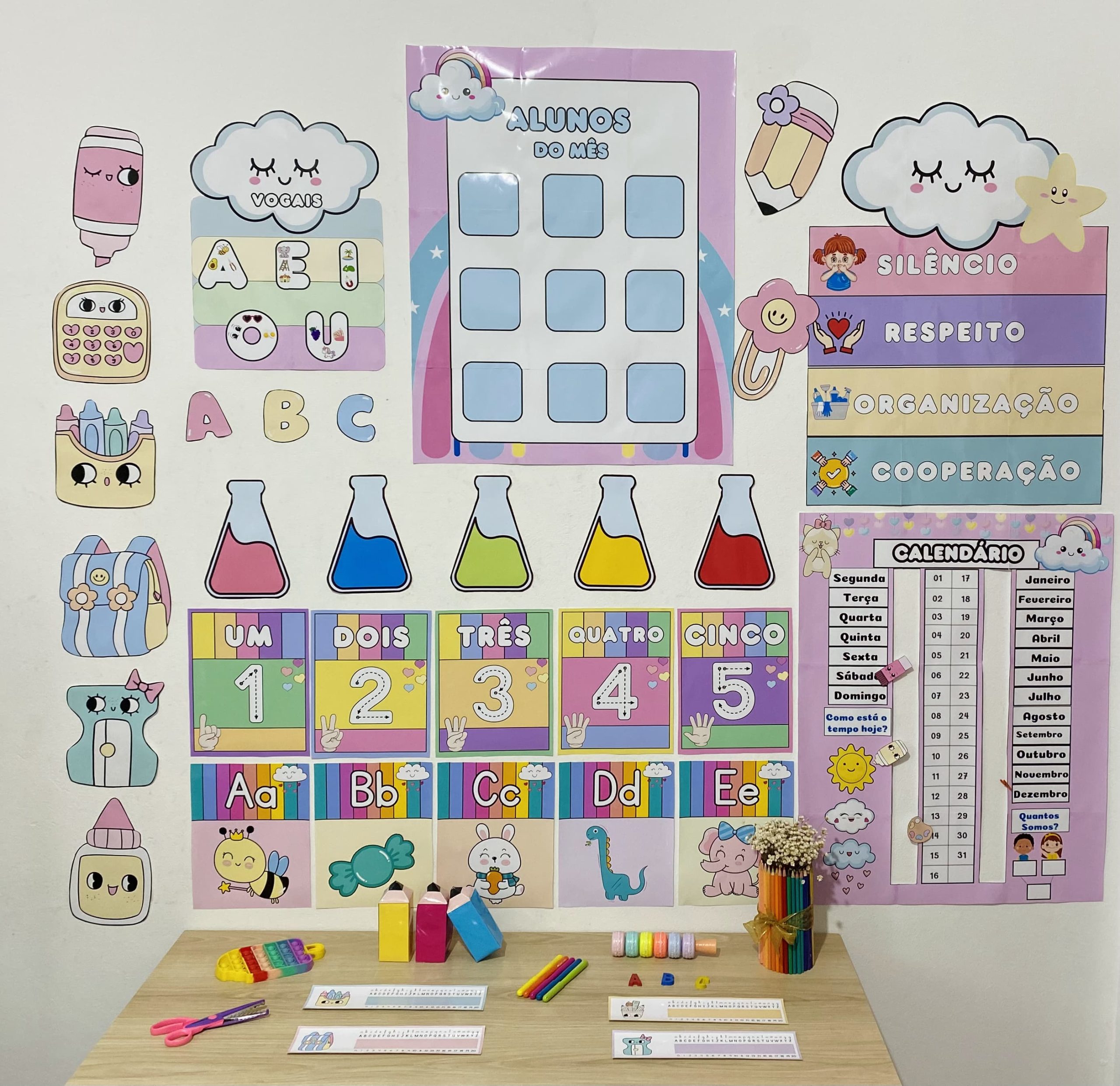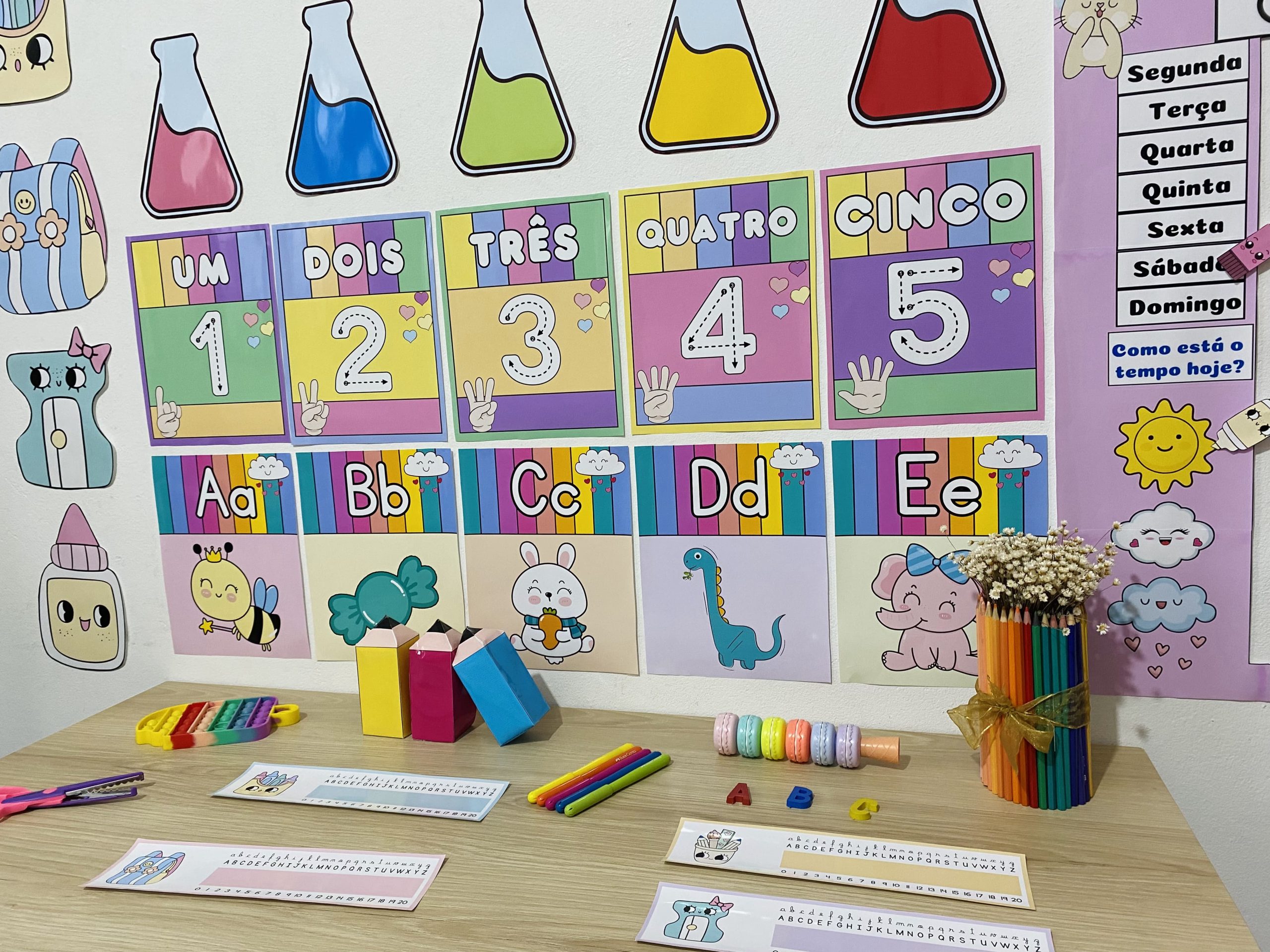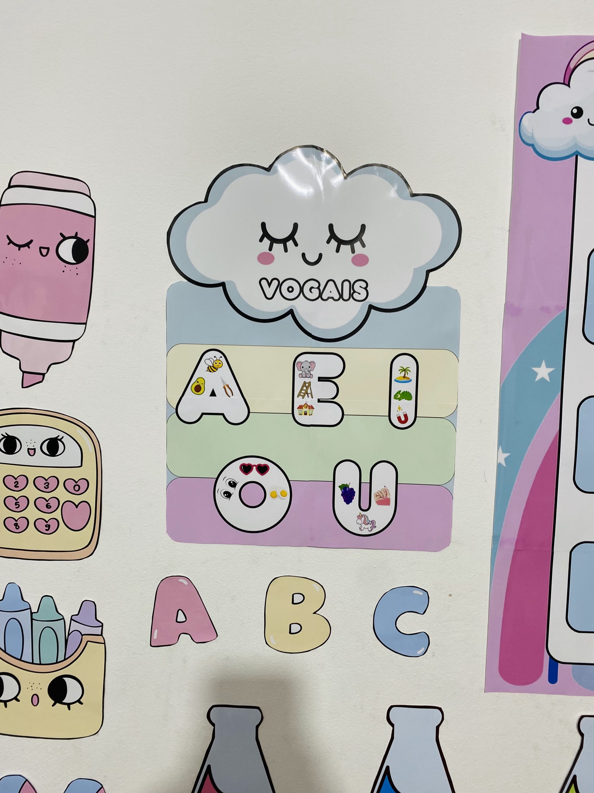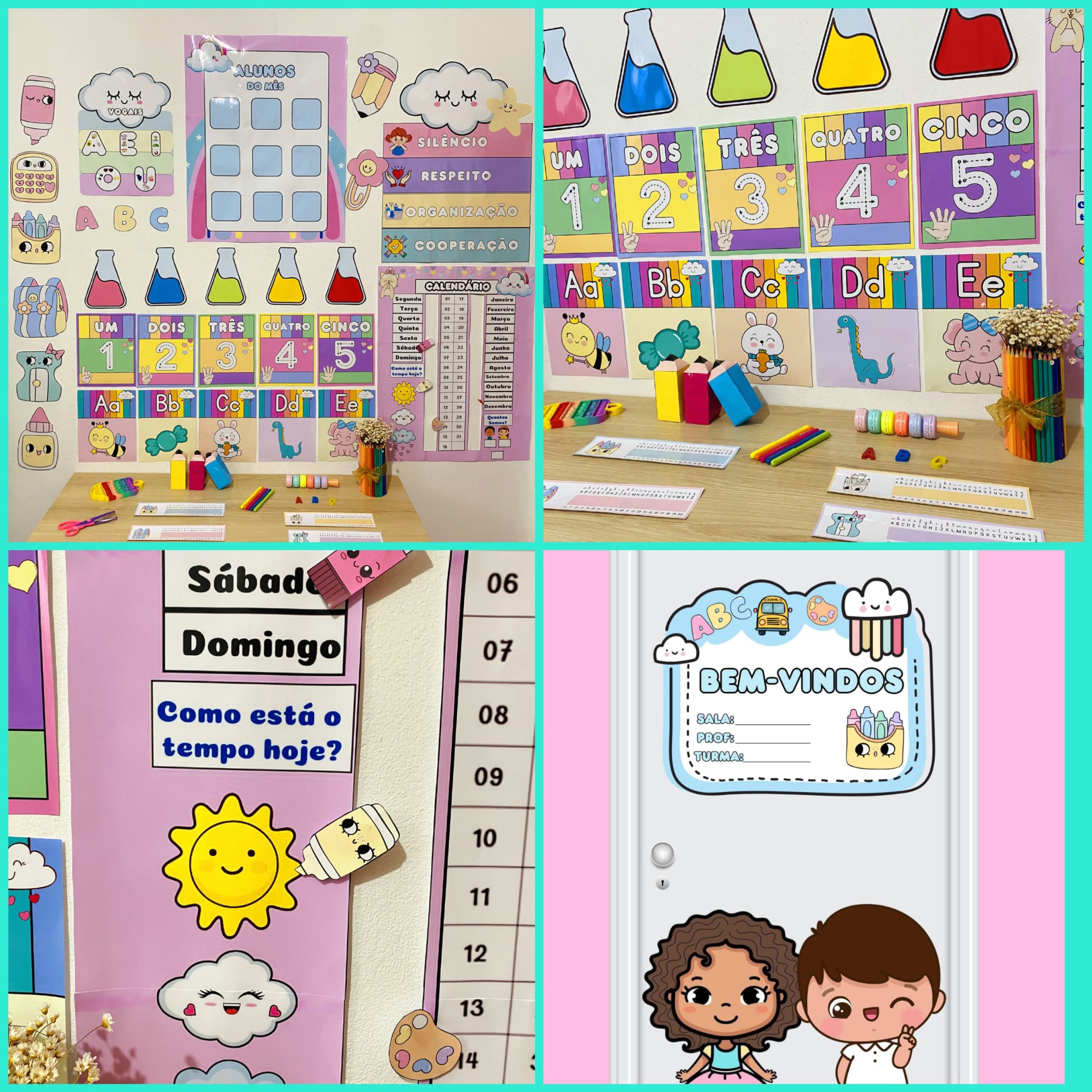 Cartazes pedagógicos e itens decorativos em tons e cores suaves