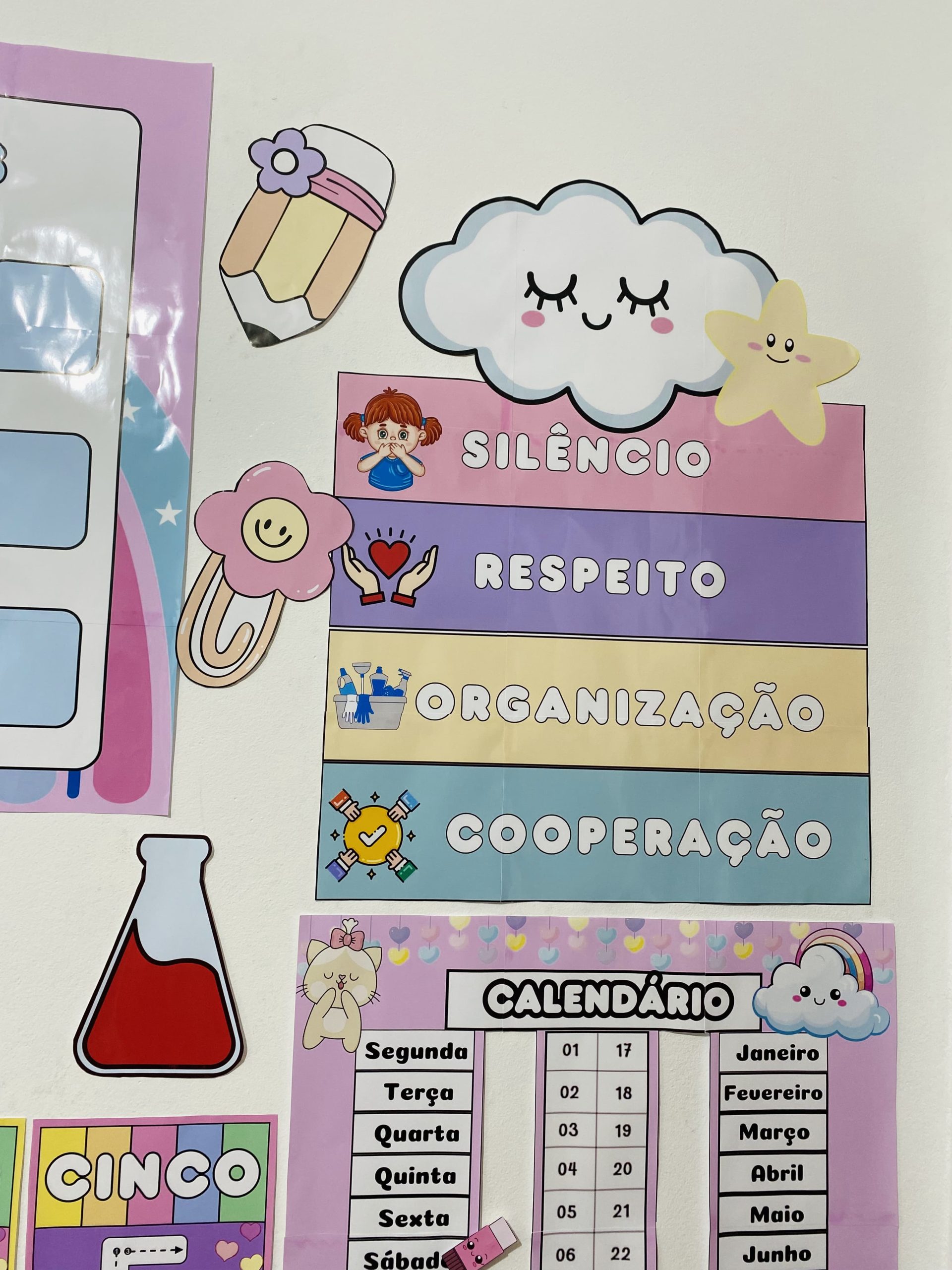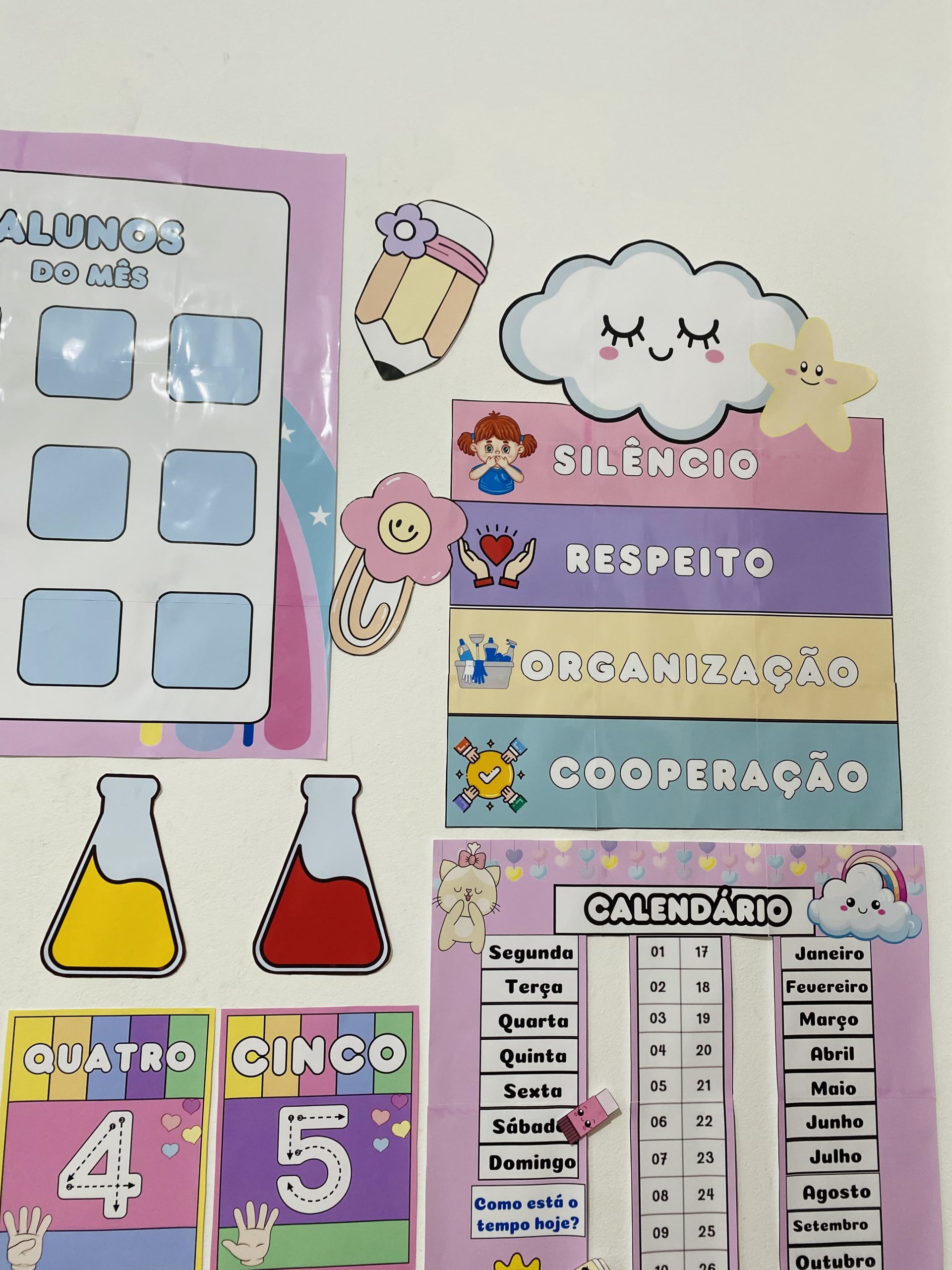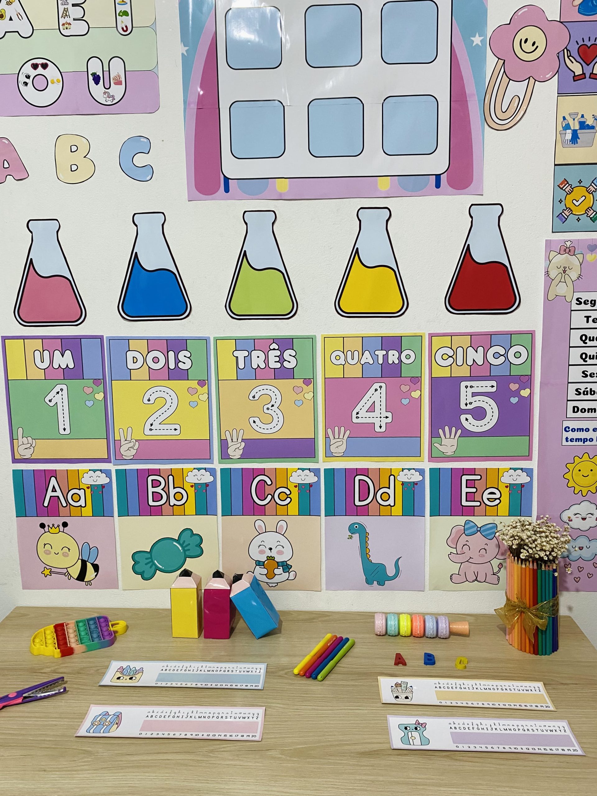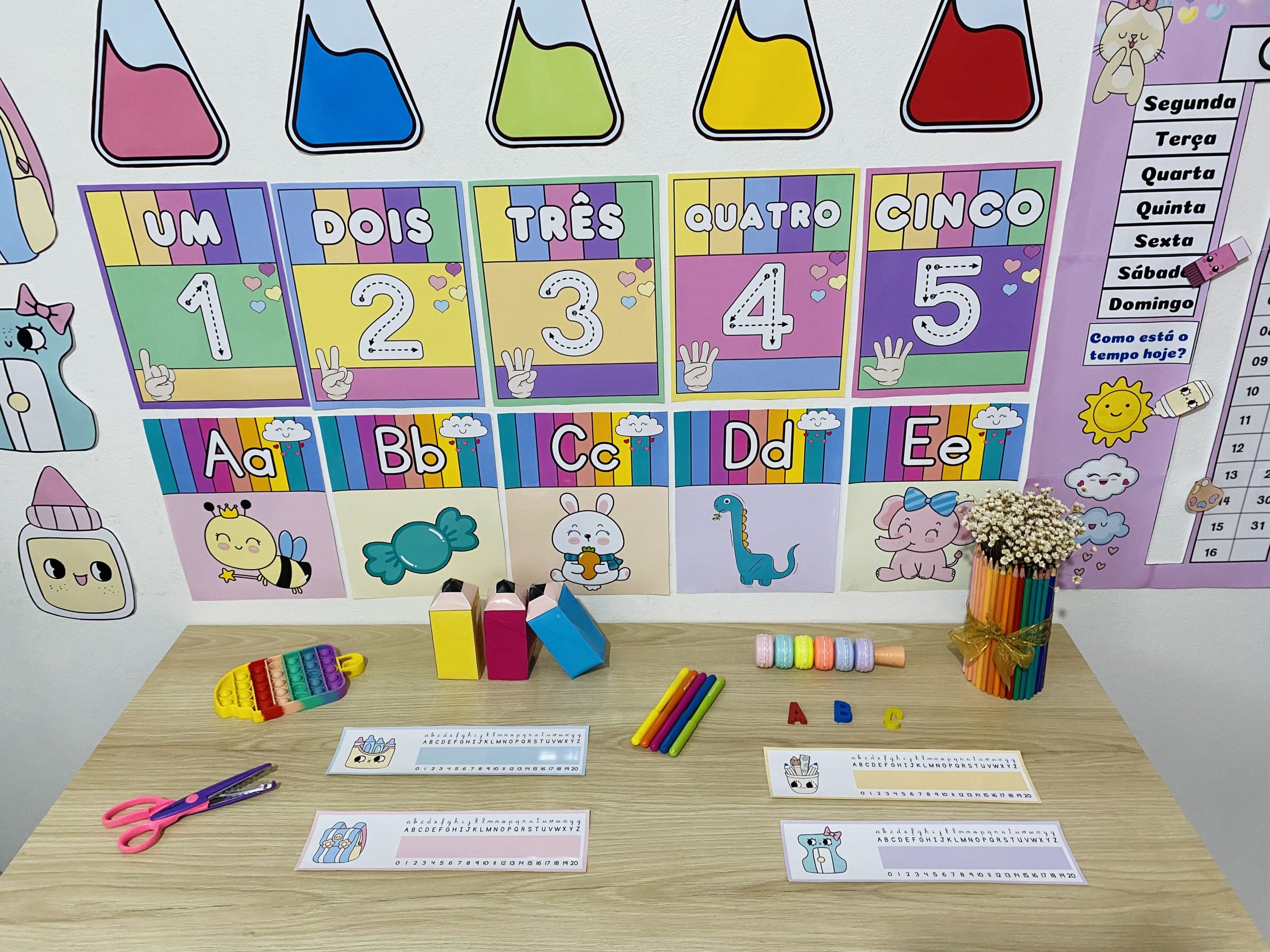 Cartazes pedagógicos e itens decorativos em tons e cores suaves