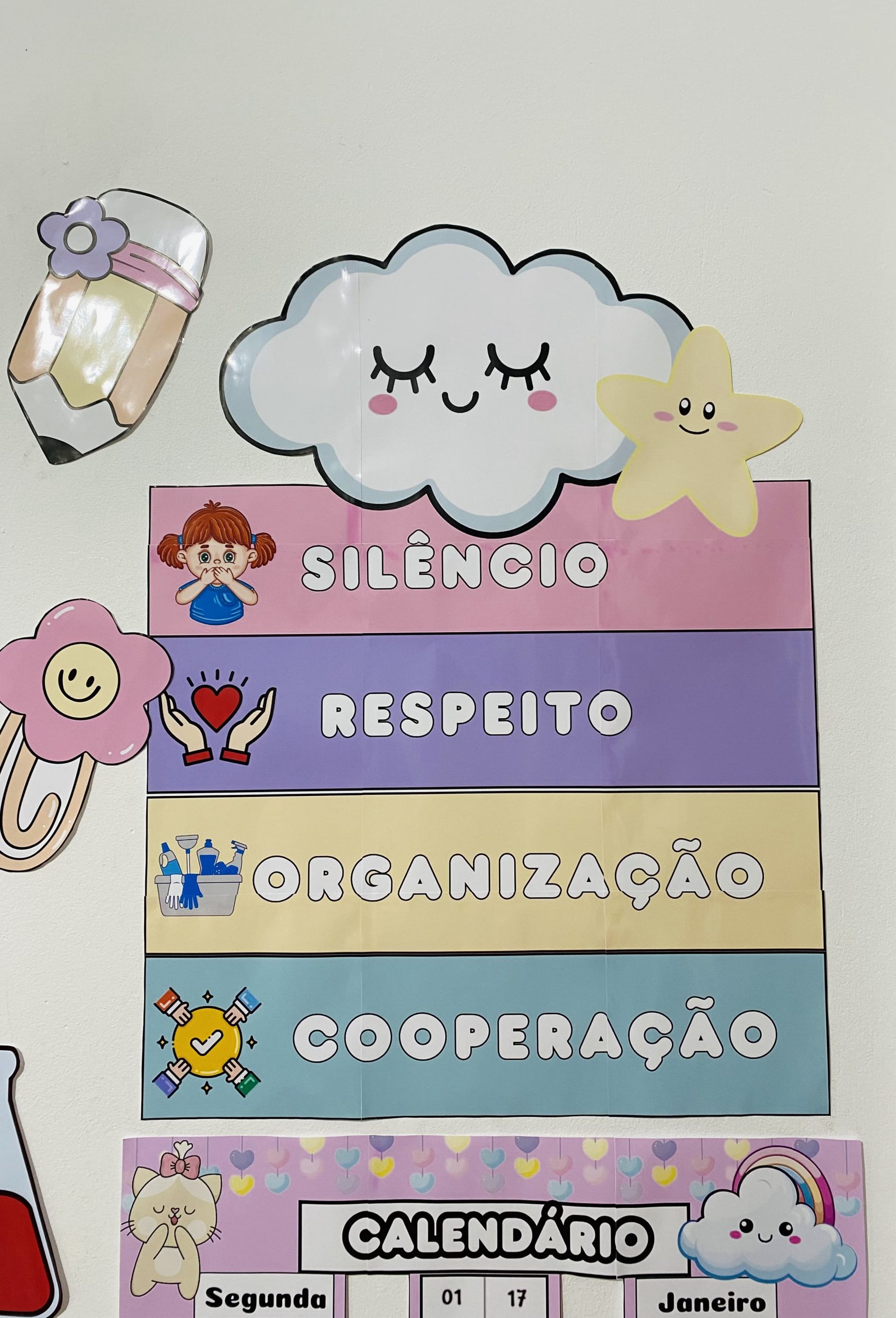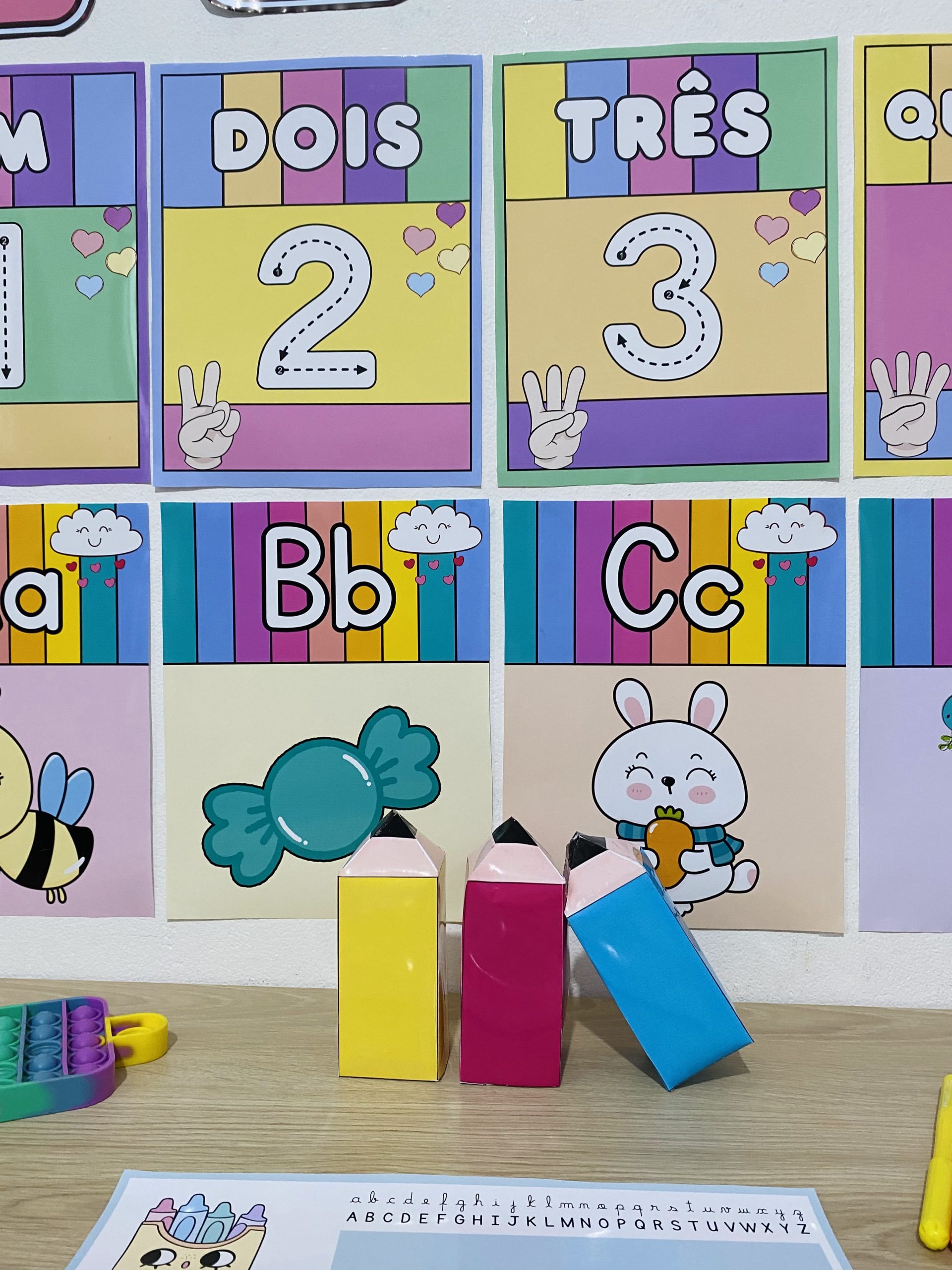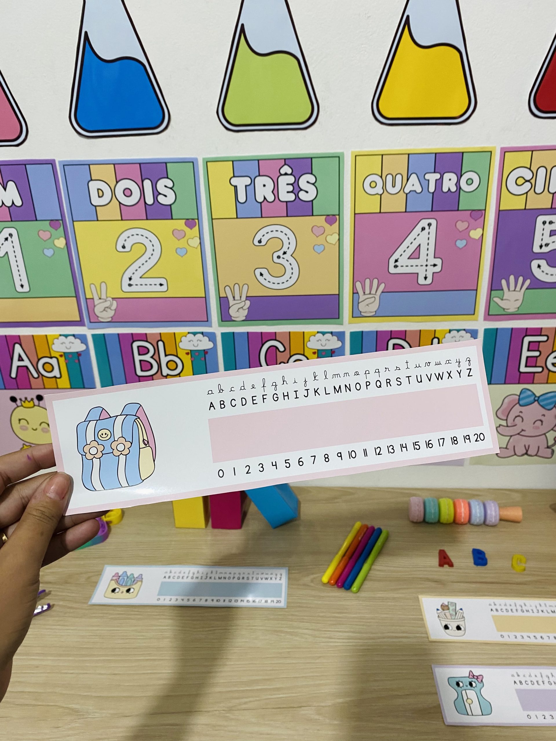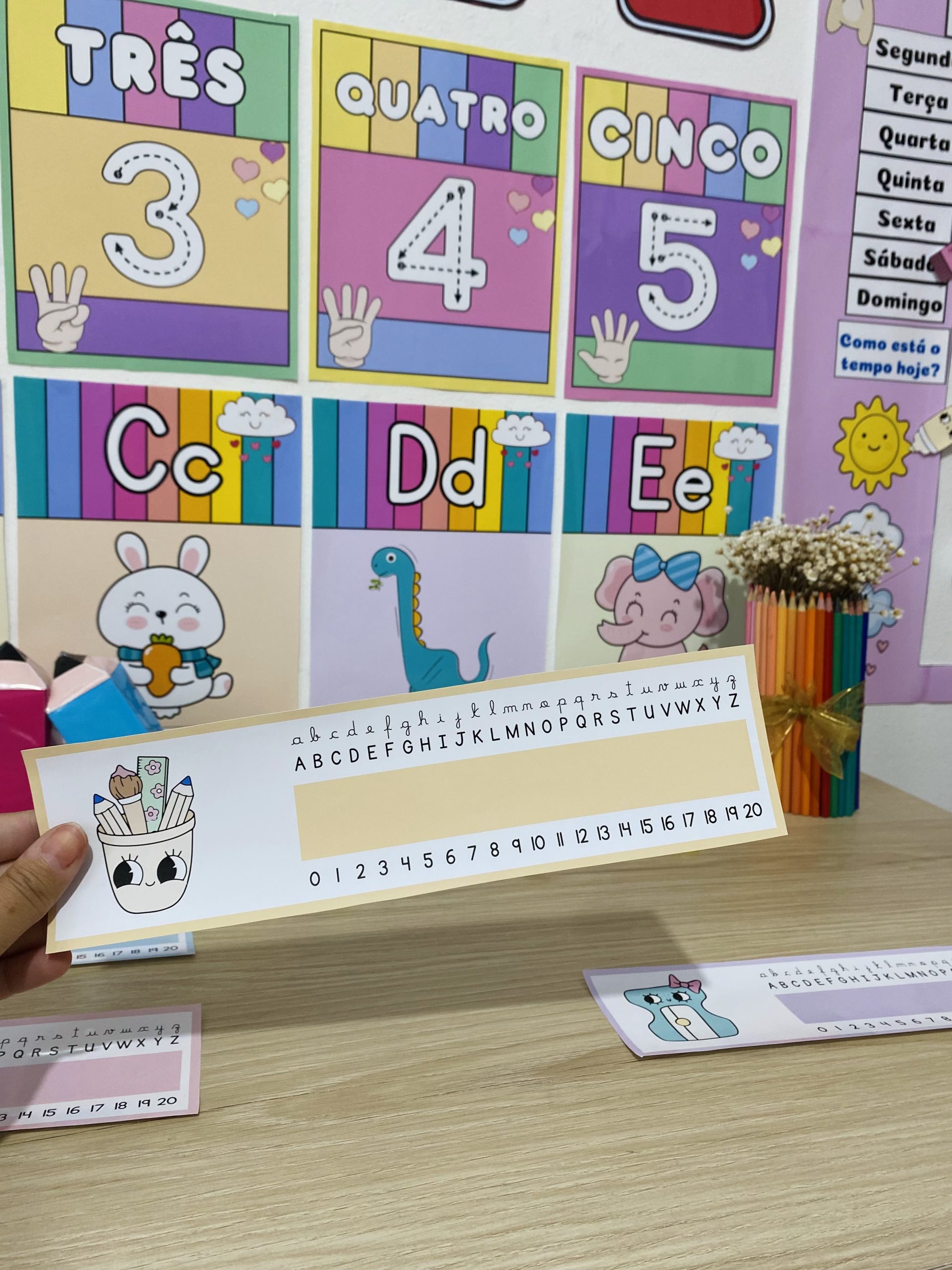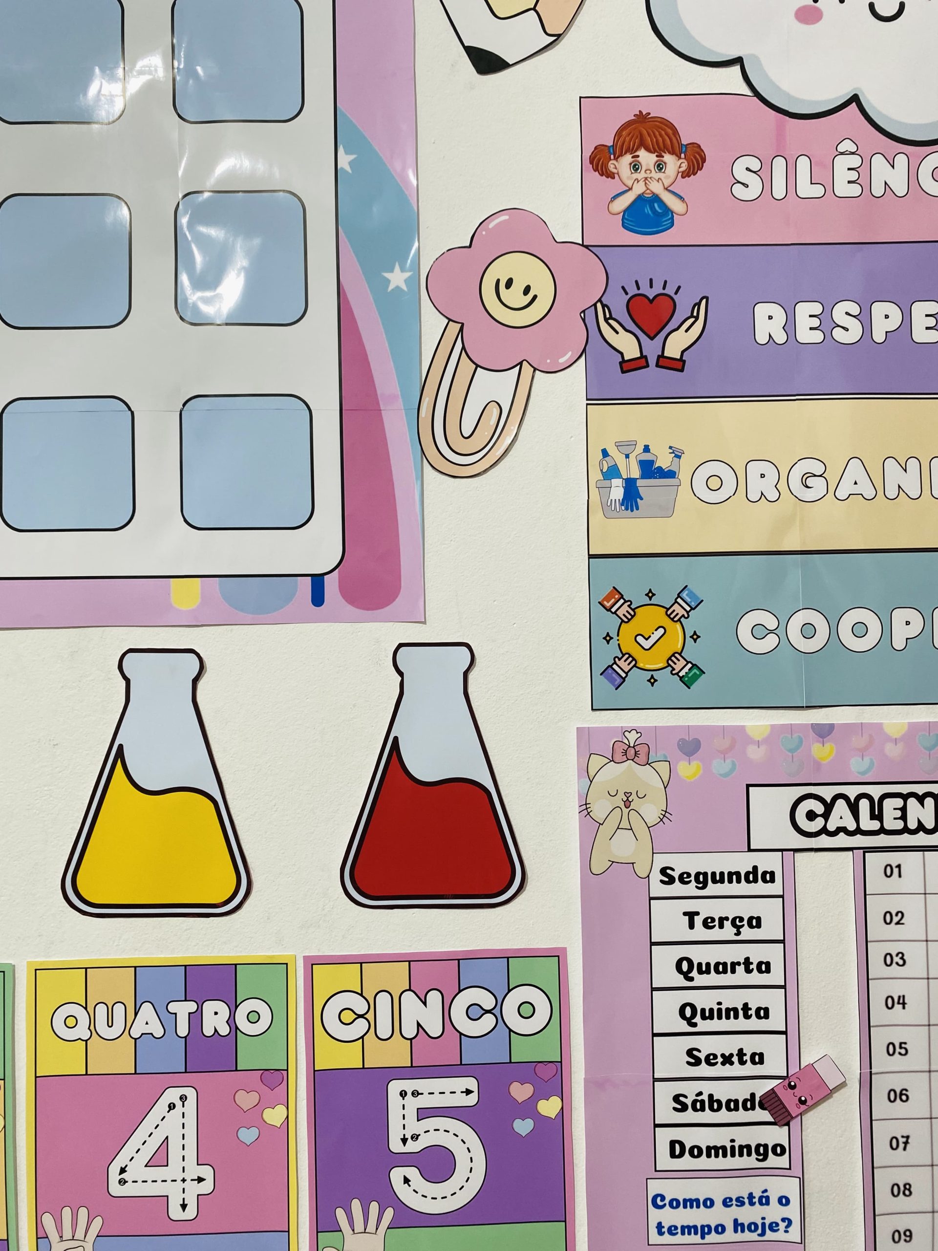 Cartazes pedagógicos e itens decorativos em tons e cores suaves