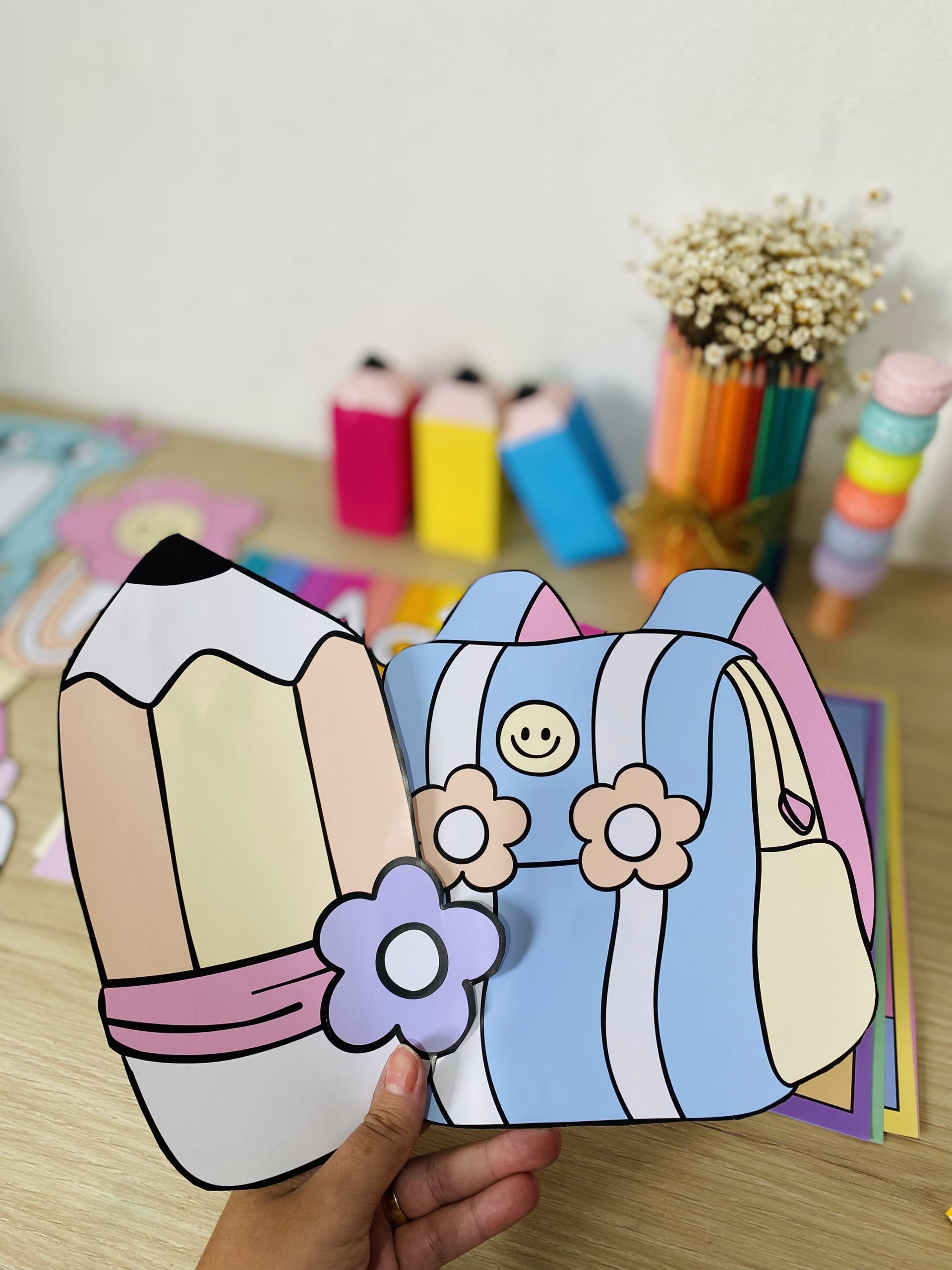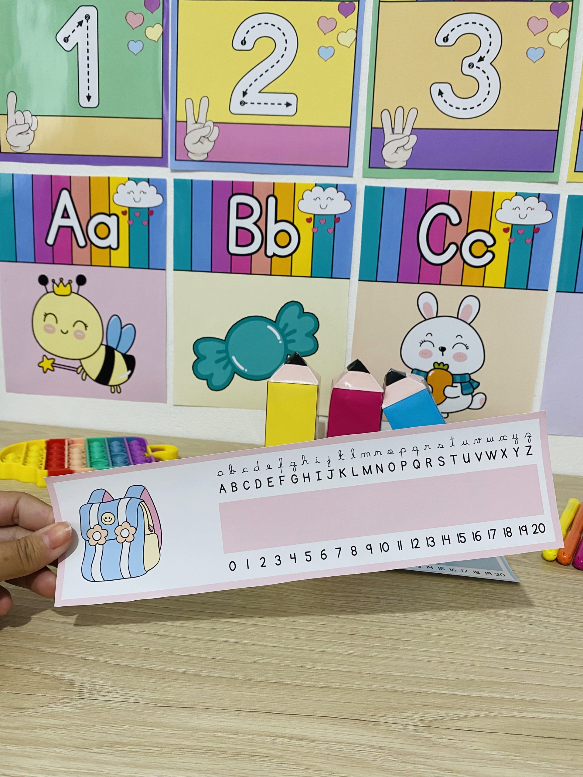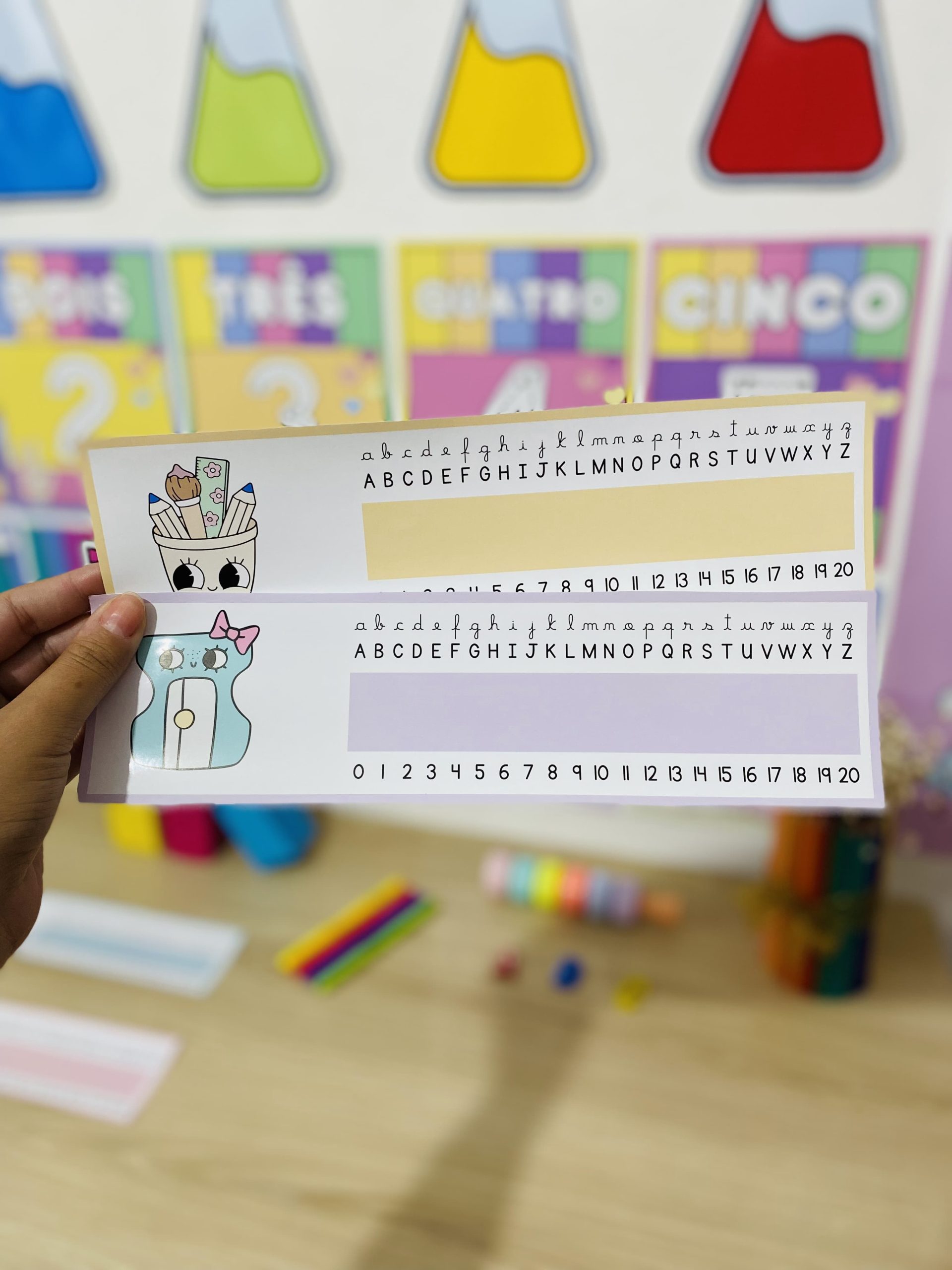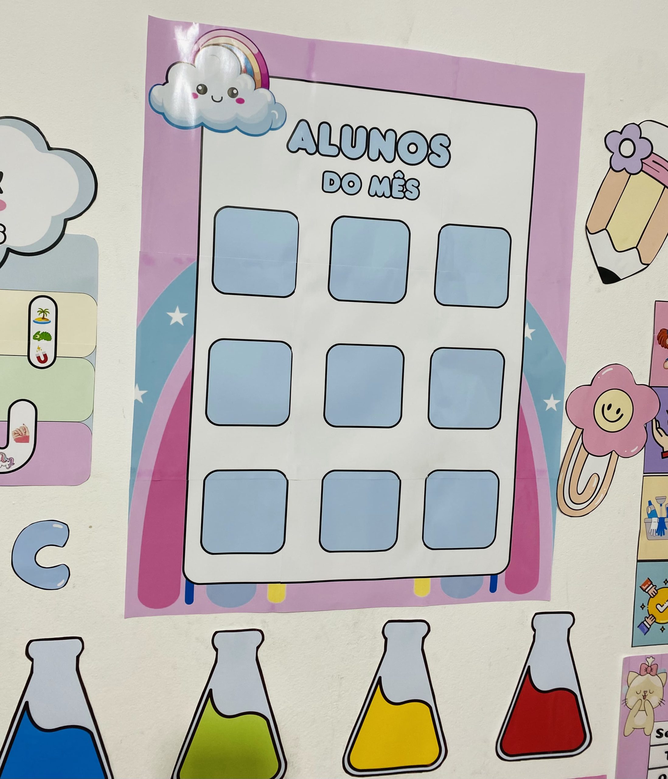 Cartazes pedagógicos e itens decorativos em tons e cores suaves