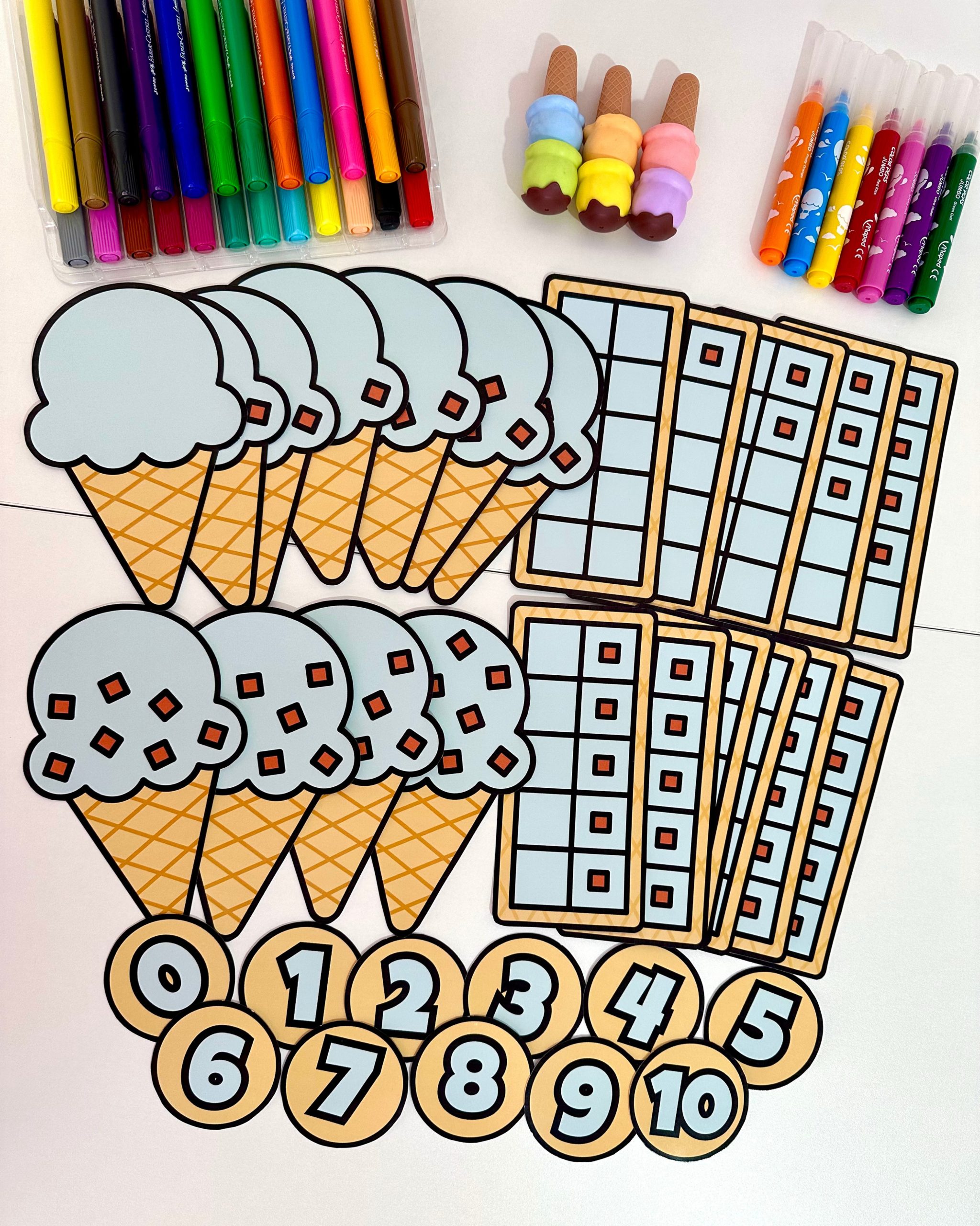 O material inclui 11 páginas, e utiliza a temática lúdica de sorvetes para tornar o aprendizado da contagem e de noções matemáticas mais divertido, acessível e interativo, atendendo às necessidades individuais de cada aluno e promovendo o engajamento e a compreensão de forma adaptada.